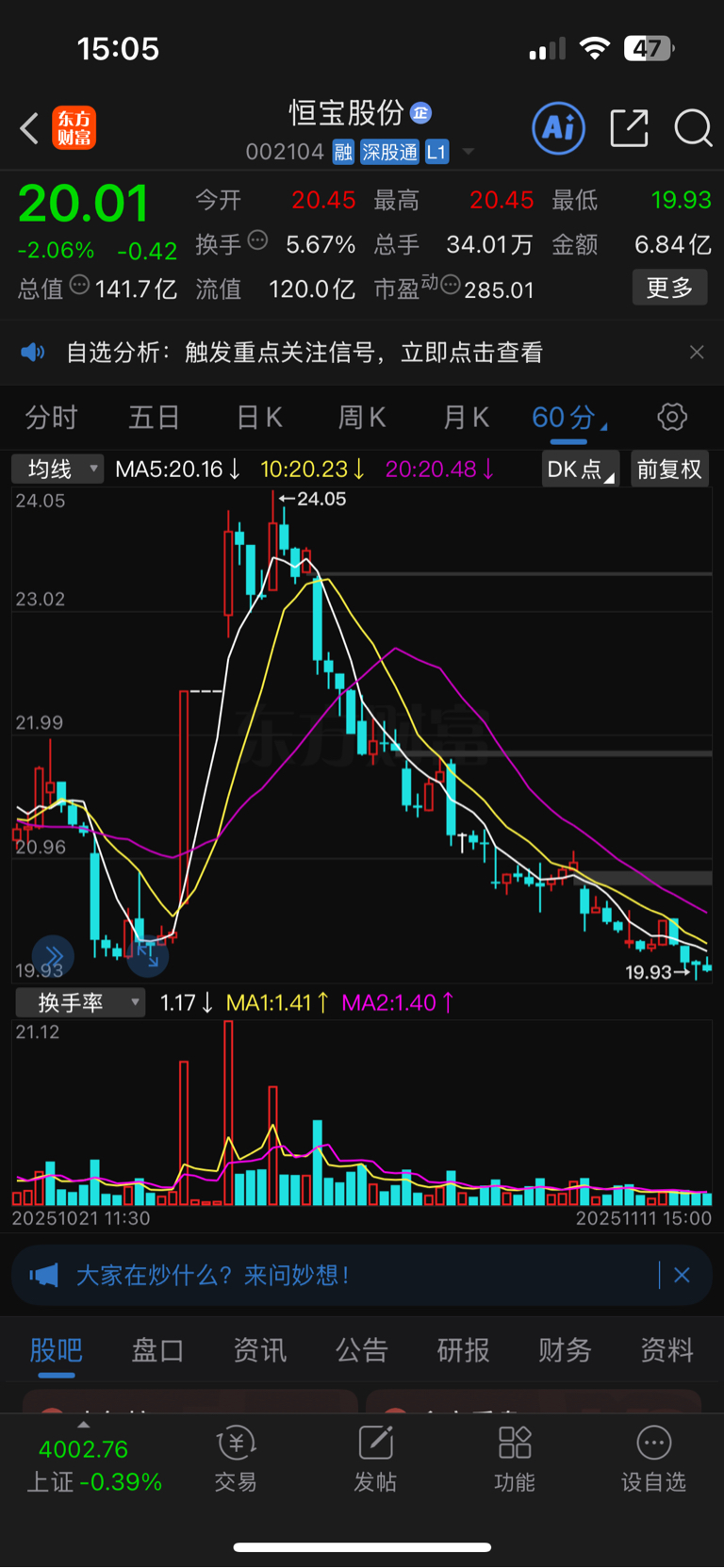 $恒宝股份(SZ002104)$ 小时线 完美无反弹