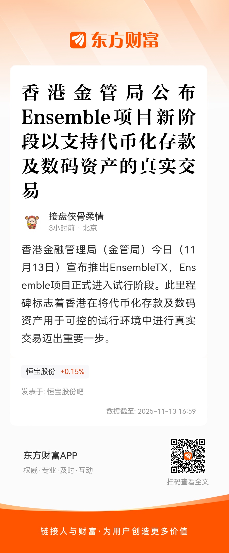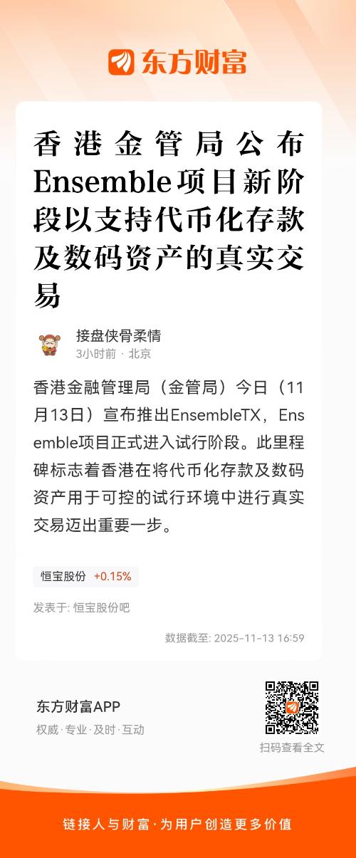 香港金融管理局(金管局)今日(11月13日)宣布推出EnsembleTX,Ensemble项目正式进入试行阶段。此里程碑标志着香港在将代币化存款及数码资产用于可控的试行环境中进行真实交易迈出重要一步。