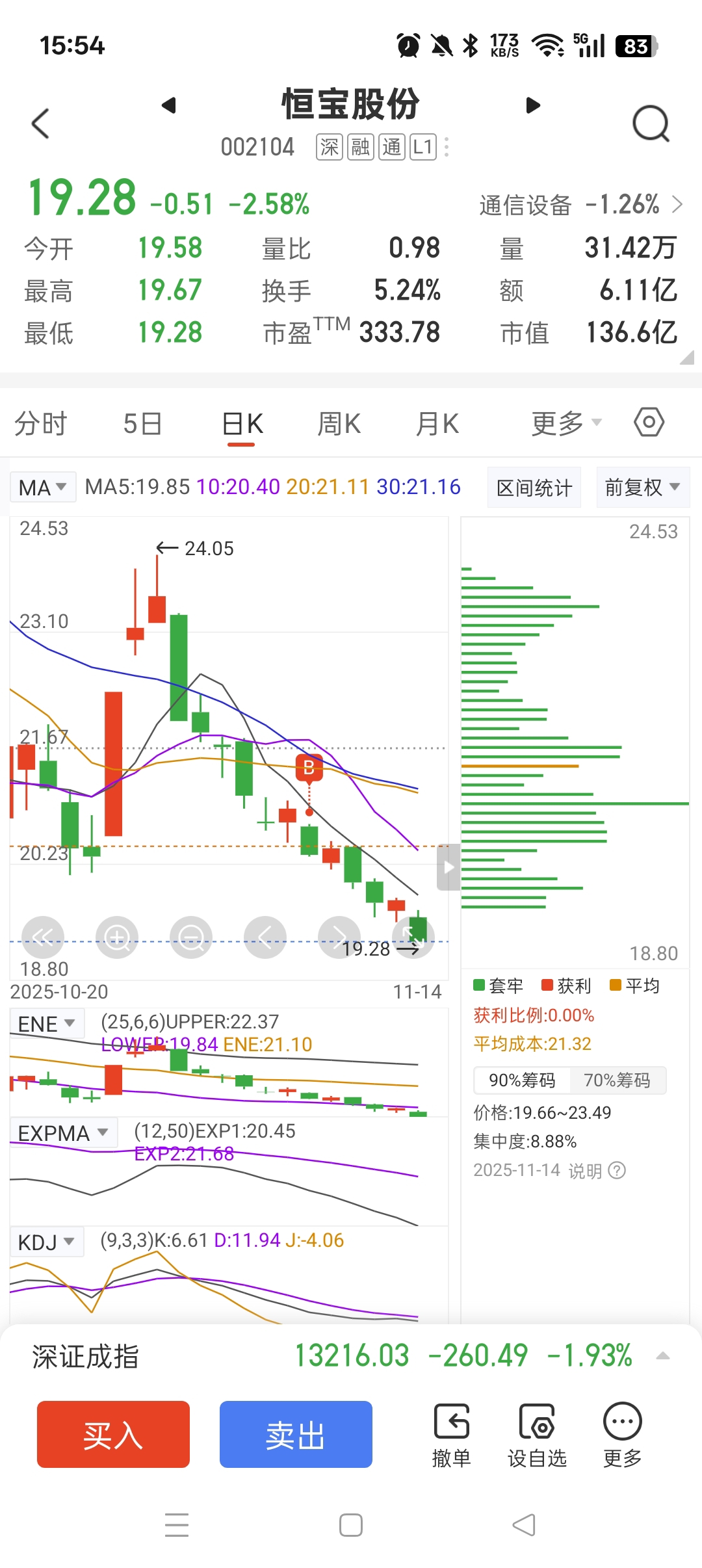 $恒宝股份(SZ002104)$ 向下趋势没减仓已经是错误了 你们还加仓 抄底 我还赚钱过一百块没买