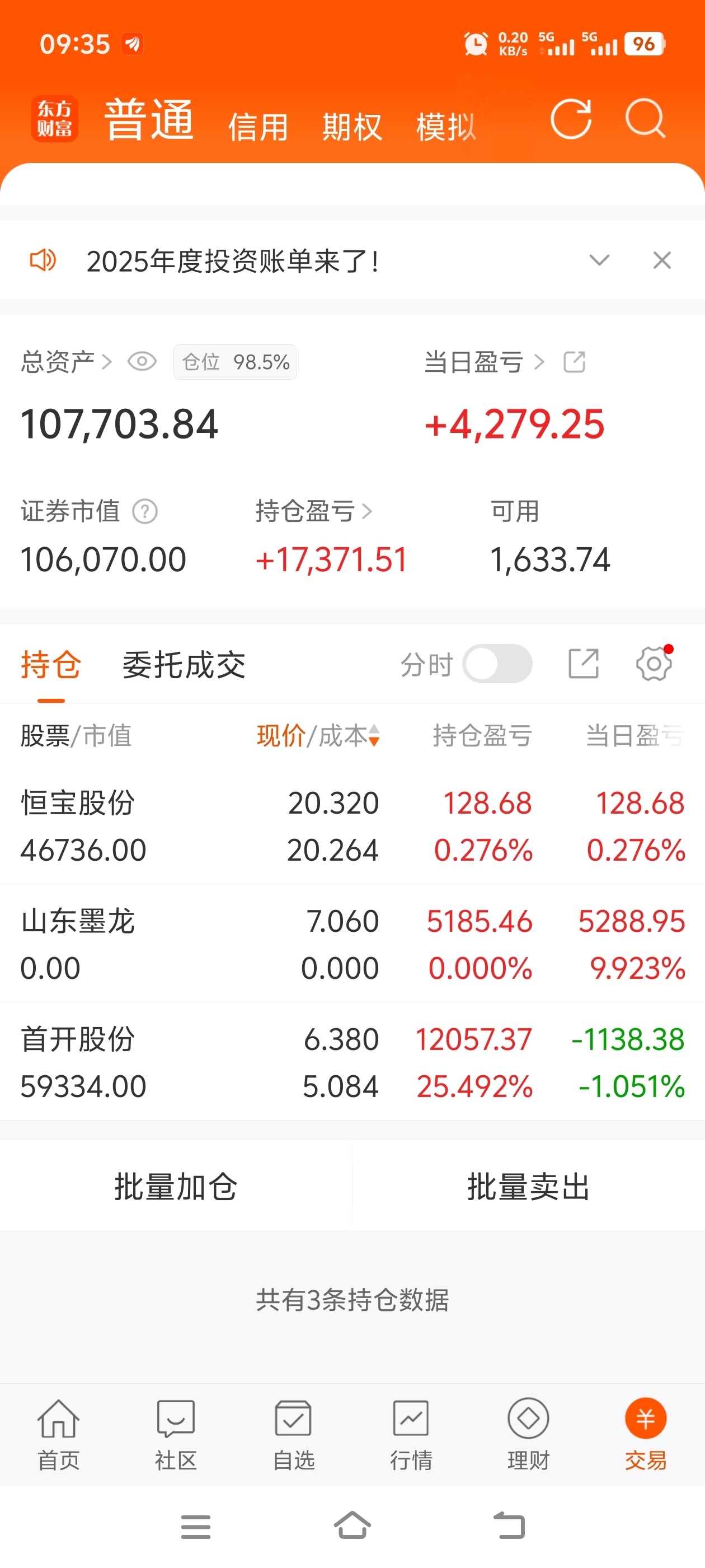 首开低开到-4.7%进了一半,拉回-3.3%,又出来一半,买了衡宝。