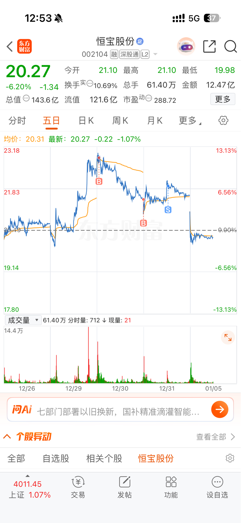 $恒宝股份(SZ002104)$ 5日线打开看就很明显 前一个交易日的拉升属于无量诱多