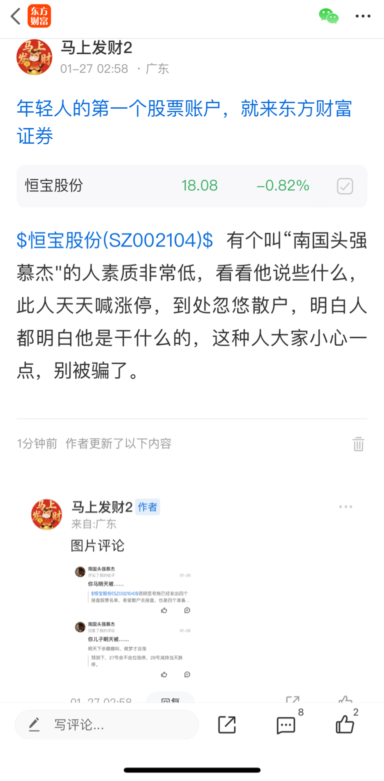 温馨提示: 1.根据《证券法》规定,禁止编造、传播虚假信息或者误导性信息,扰乱证券市场;2.用户在本社区发表的所有资料、言论等仅代表个人观点,与本网站立场无关,不对您构成任何投资建议。用户应基于自己的独立判断,自行决定证券投资并承担相应风险。《东方财富社区管理规定》