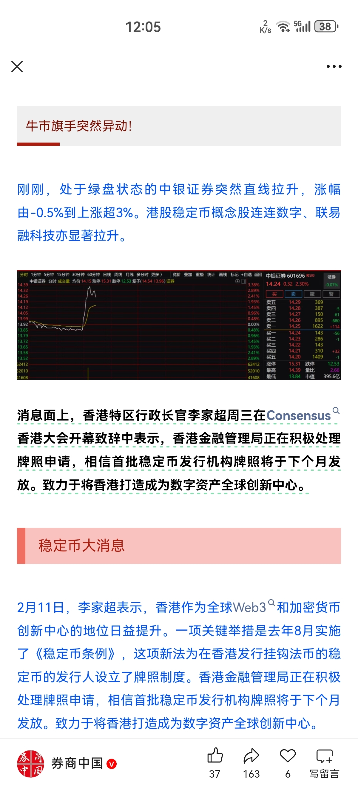 $恒宝股份(SZ002104)$ $拉卡拉(SZ300773)$ $御银股份(SZ002177)$ $四方精创(SZ300468)$ 刚刚香港特区行政长官李家超周三在大会上表示,稳定币下月发牌,打造成为数字资产全球创新中心!刚刚中银证券直线拉升!
