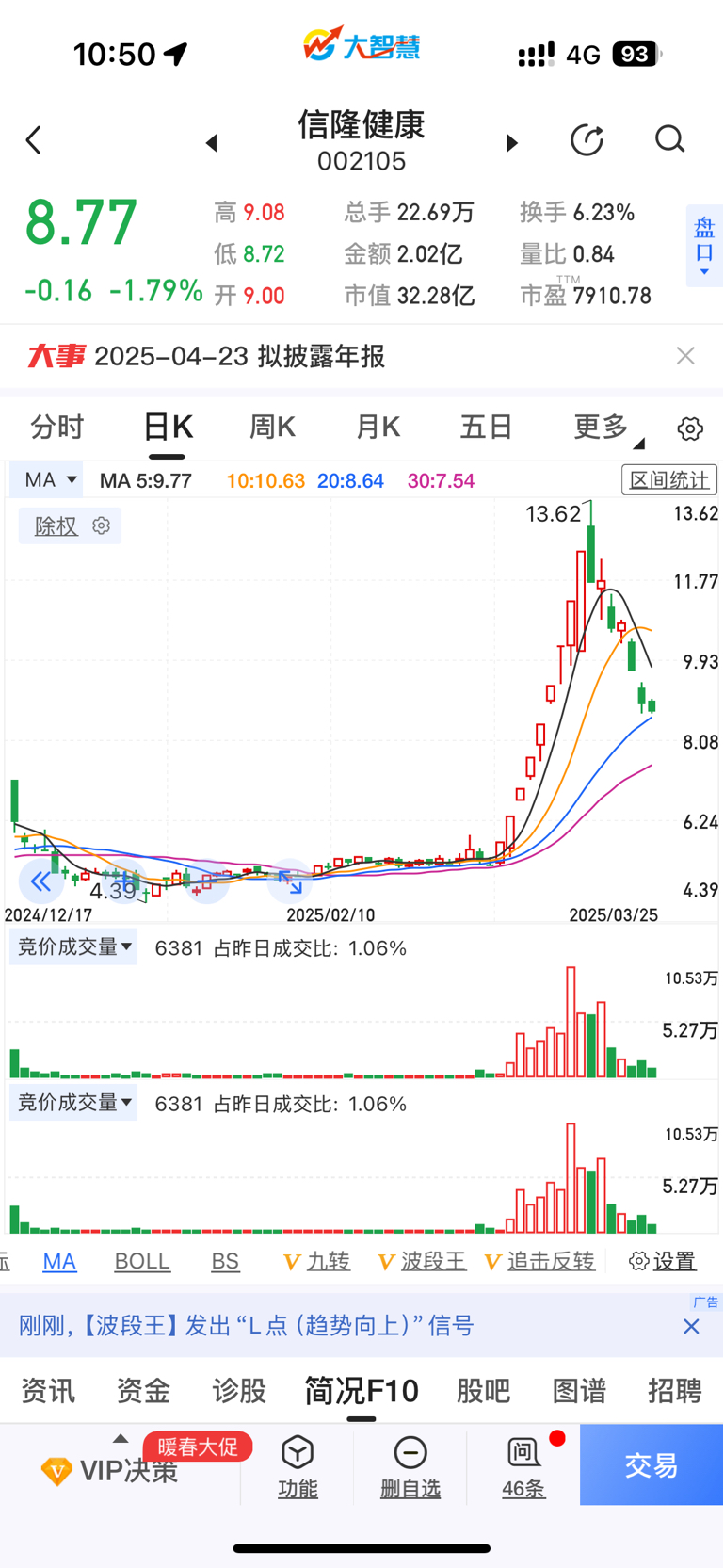 $信隆健康(SZ002105)$ 这里8.08有一个非常重要的平台,如果能破了就好了!可以买进30%仓位,今天的走势看来我还是天真了一点,主力击穿20均线的决心非常强!今天的即时走势看来20日均线根本就没有支撑力度!现在我也将破30日均线作为我的第一建仓机会!