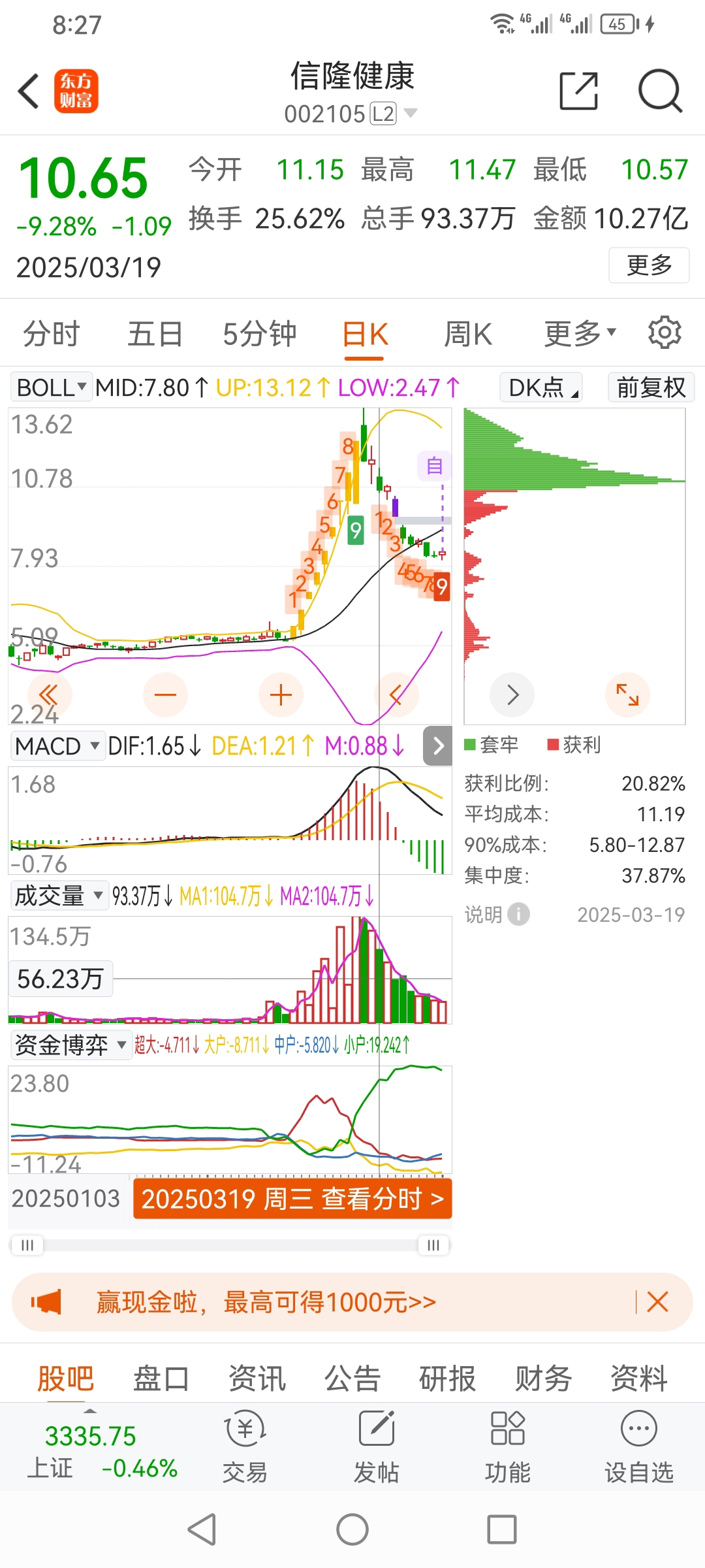 $信隆健康(SZ002105)$ 军哥,买股票,抄底,一定要等到9转系统,下跌走完。股票出现小阳线基因,放量,大盘走好,才能买进。否则砸盘股票,看空。