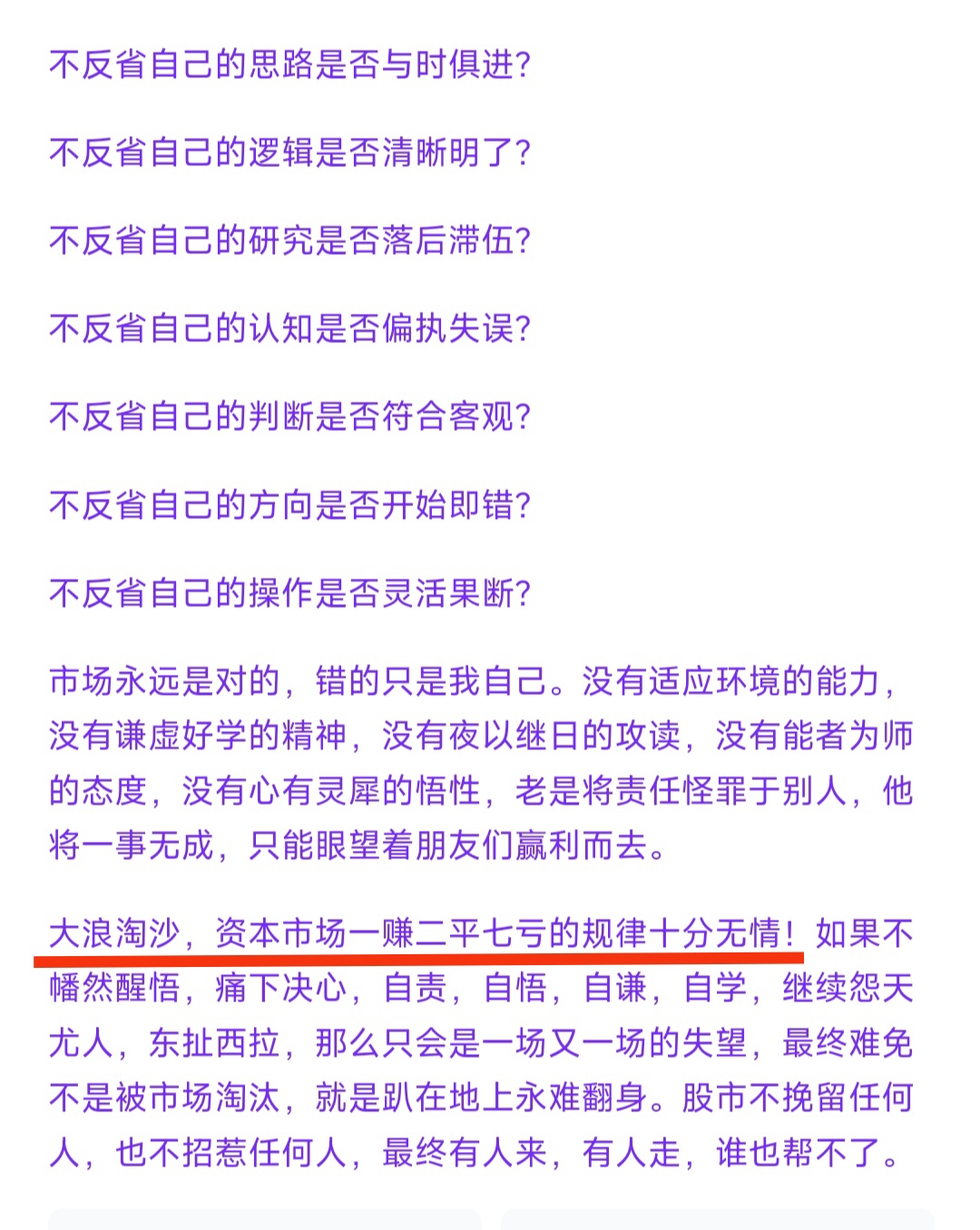 $信隆健康(SZ002105)$ 一、不要试图寻找不可能的捷径,世上没有便宜的事,只有脚踏实地才是最好的方法无论做何事。大道甚夷,而民好径!二、不要对明知不是好事的事过分好奇,有可能你会因此而丧命。祸莫大于不知足,咎莫大于欲得!三、不要在冲动时做任何决定,否则这个决定就有可能成为你一辈子的遗憾。轻则失根,躁则失君!