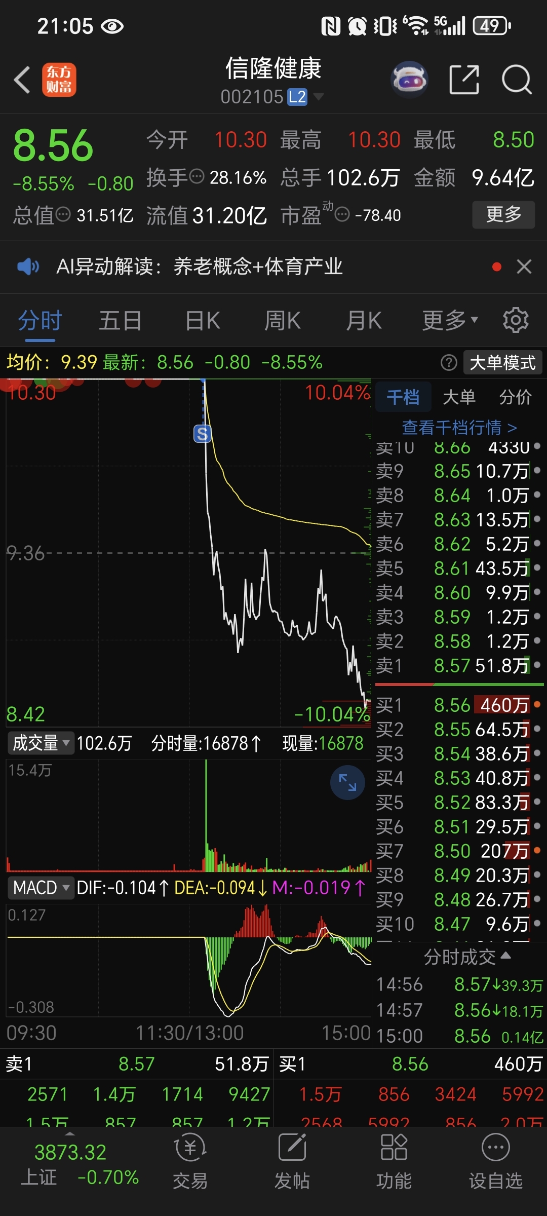 $信隆健康(SZ002105)$ 一点开盘封单越来越少,还有一个亿,前排全是小单,果断卖出