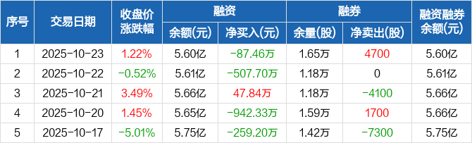 莱宝高科:融资净偿还87.46万元,融资余额5.6亿元(10-23)