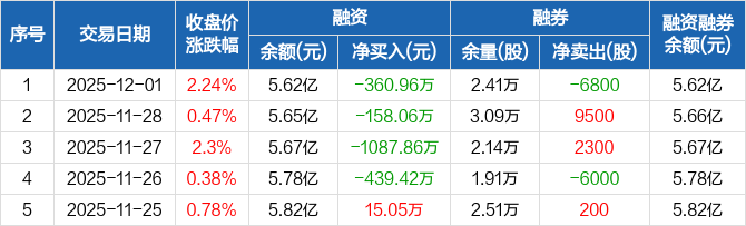 融资方面,当日融资买入1055.21万元,融资偿还1416.17万元,融资净偿还360.96万元,连续4日净偿还累计2046.3万元。融券方面,融券卖出100股,融券偿还6900股,融券余量2.41万股,融券余额26.44万元。融资融券余额合计5.62亿元。