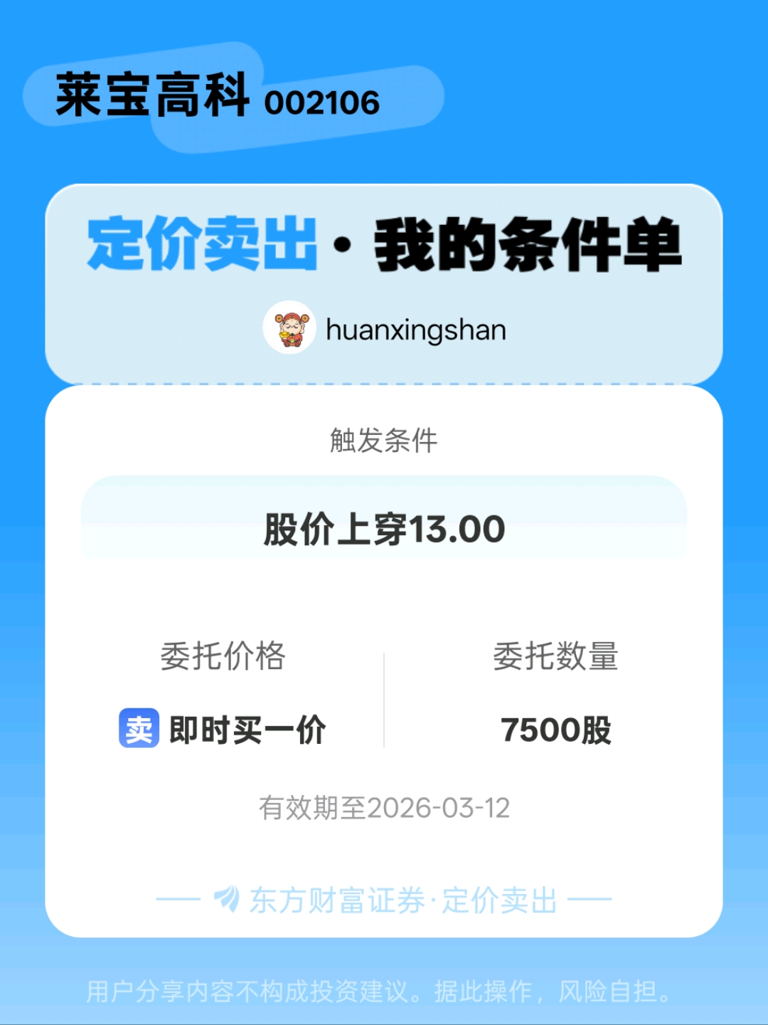 #条件单交流# #定价卖出晒单# 一位股神设置了一个定价卖出条件单,接下来就是见证奇迹的时刻~$莱宝高科(SZ002106)$