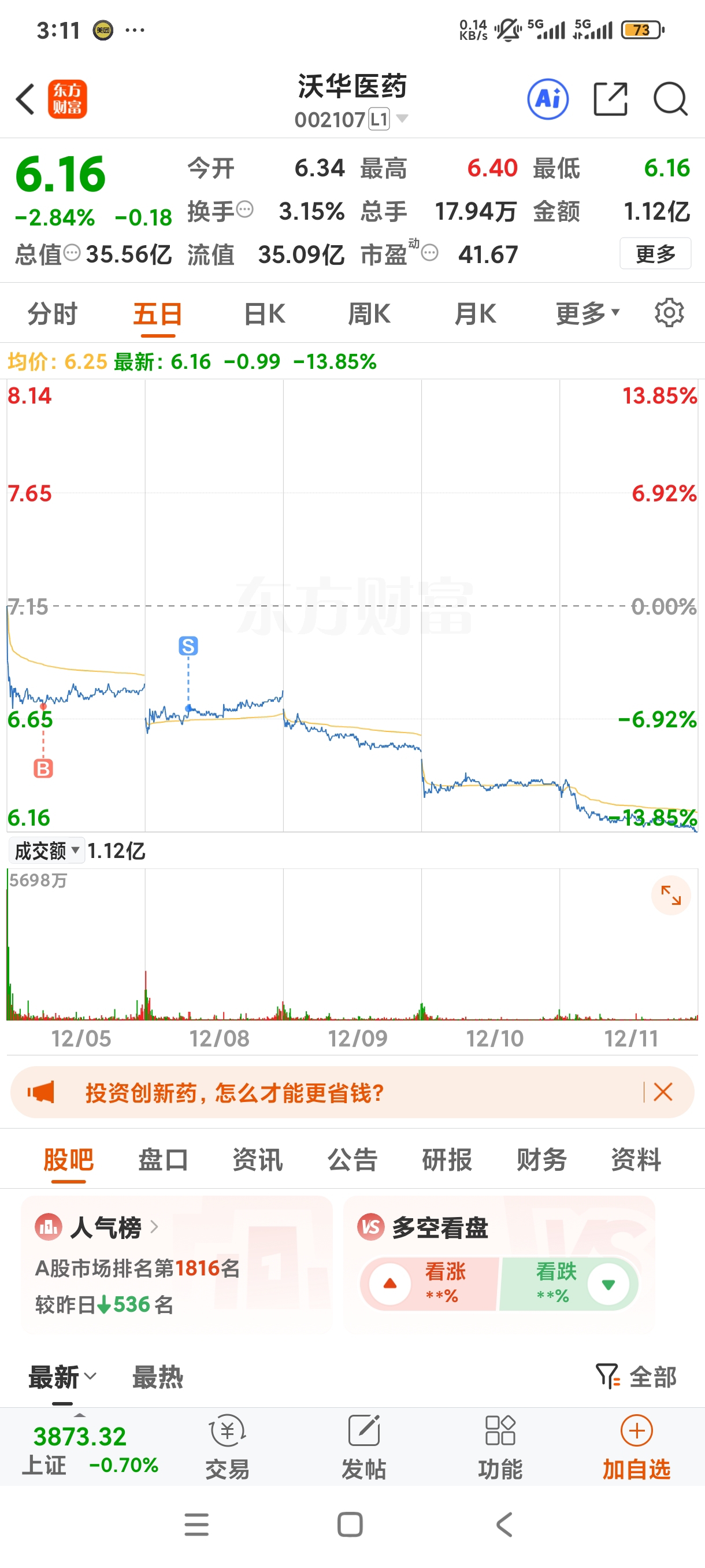 $沃华医药(SZ002107)$ 还好,走对了,小亏出局,你给我等着,等再跌一段时间,跌够了我再买你