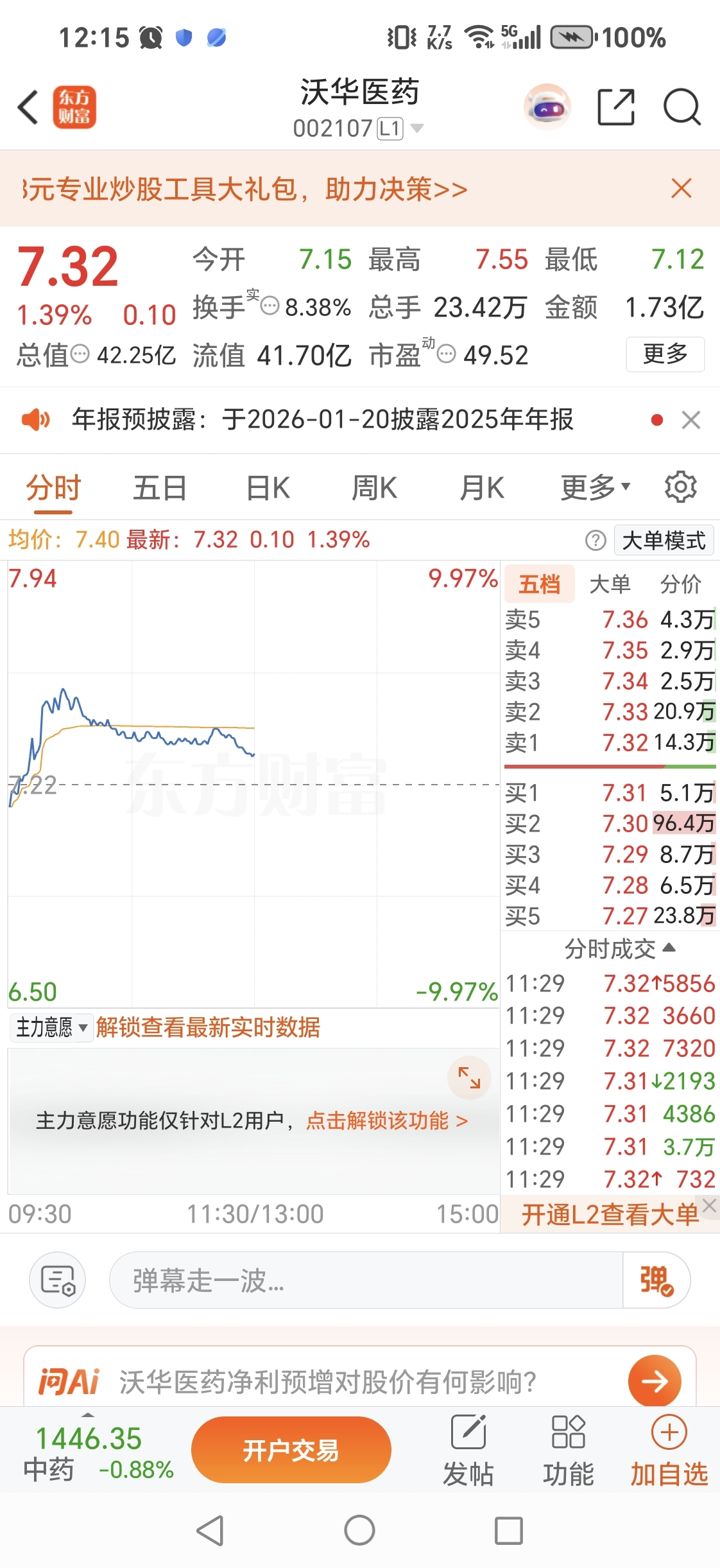 $沃华医药(SZ002107)$ 下午只会往下走,强势势的话会在黄色均线以上横盘蓄势,然后就像长缆科技一样,收盘突然拉升,下午开盘估计就会马上涨停,在你和长缆科技之间选了你是因为长缆科技开盘九个多点后往下走,我买进去位置有点高,怕不涨停会回落被套,哪知道你这么差,差一点点突破前高,就是突破不了,还是太弱了
