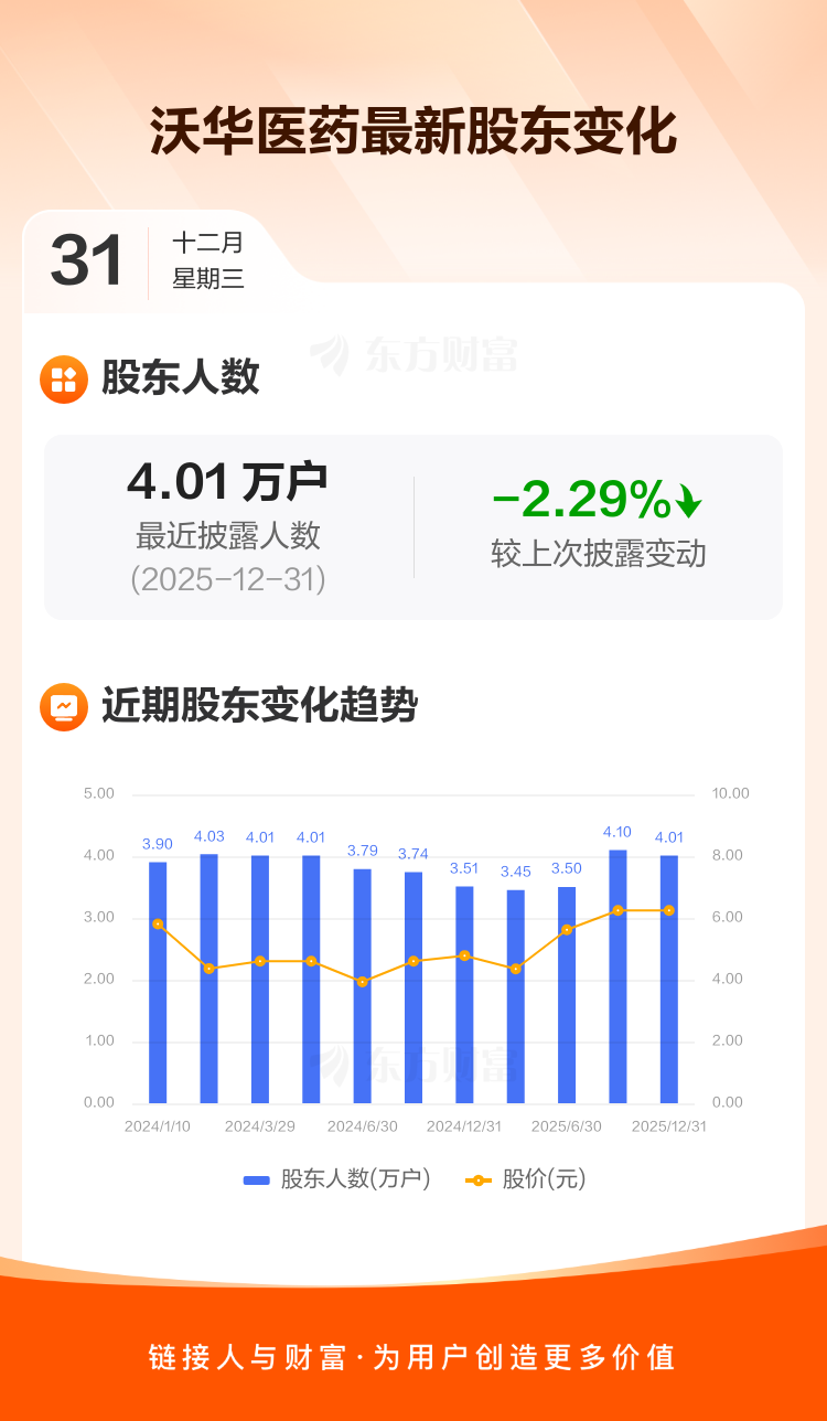 沃华医药:截至12月31日最新股东户数4.01万户,较上期减少2.29%