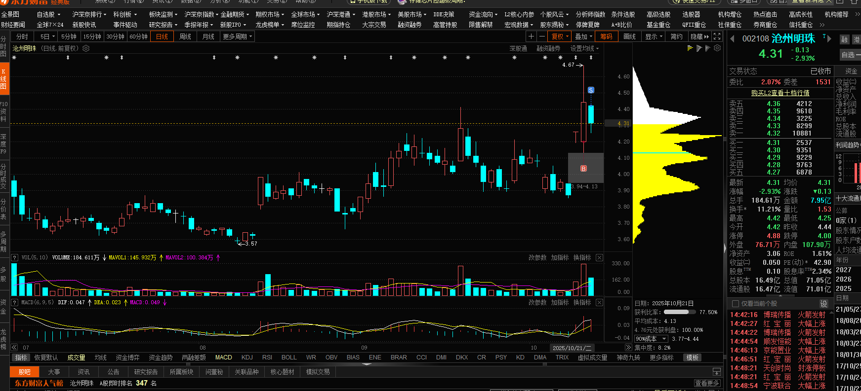 昨日试盘抛压极大,上影线压力大,开盘集合竞价出;估计它还会调整几天