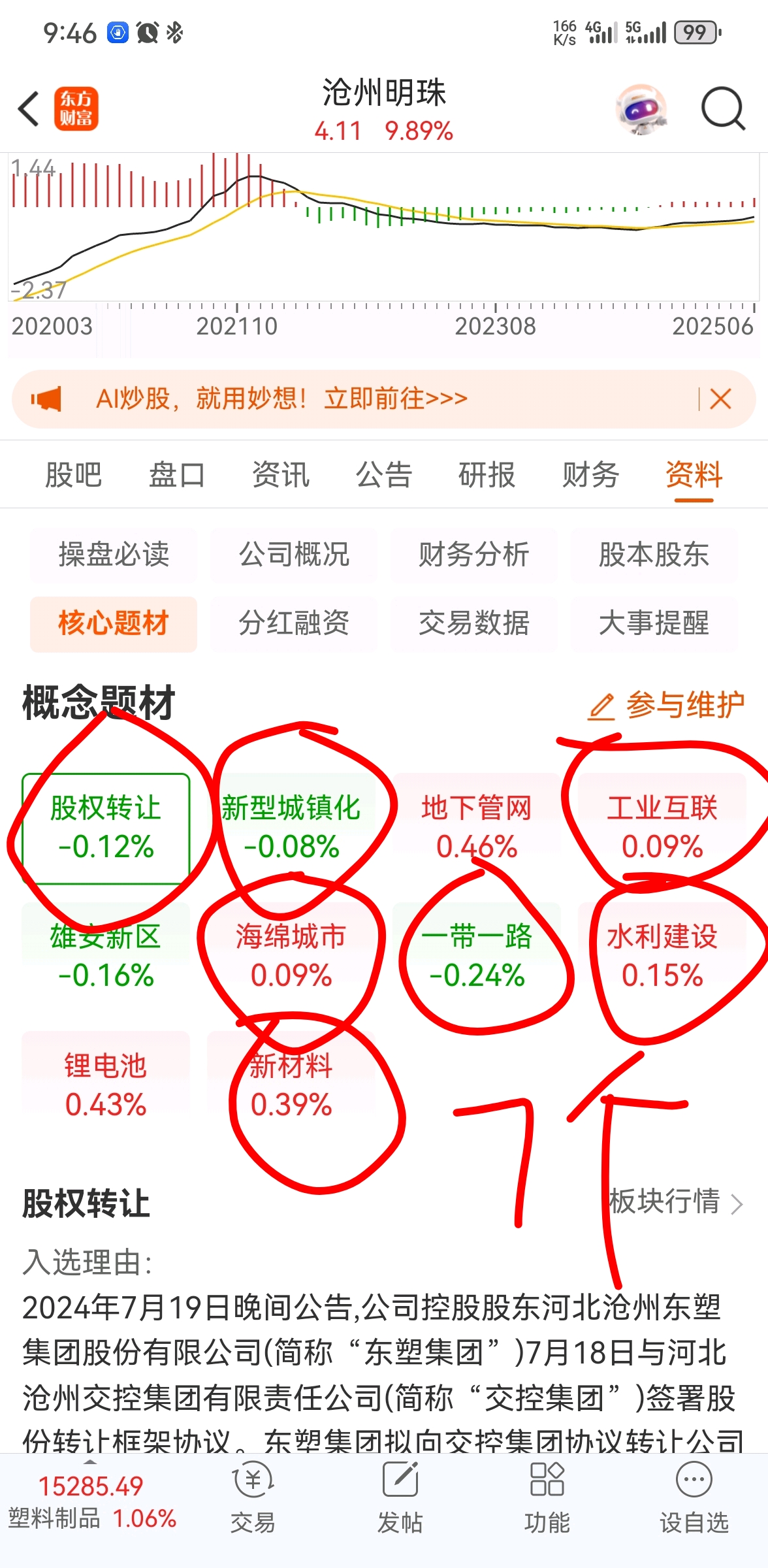 沧州明珠从自选就有三个概念到现在,同花顺和东财其它所有的概念,都是我给加上的!!!没有第二个人,因为我打完电话下班当天东财就更新了(每次添加都各种打电话给东财软件客服,电话费都去了几十),沧州明珠最近一年半,有130几个问题是我提的,没办法,面对这样的管理层,只能靠自救了,最高被套37个点共计150个以上的本,就是不割肉!!沧州明珠的帖子,永远是我和广东一哥们去支撑着,他也失望的有大半年没怎么更新过,他应该也套了五年,我是因为补仓了才把成本压下来,祝福他获利解套!!
