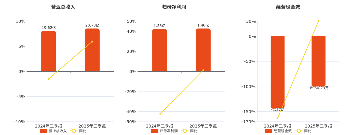 公司营业总收入为20.78亿元。归母净利润为1.40亿元。经营活动现金净流入为-8930.29万元。