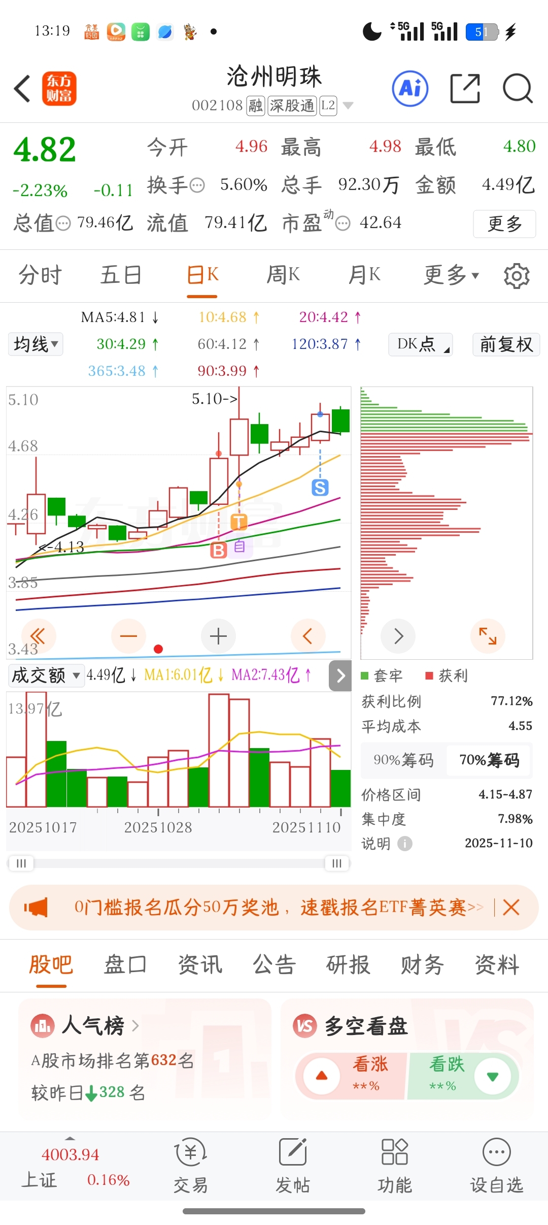 $沧州明珠(SZ002108)$ 我准备4.72左右进