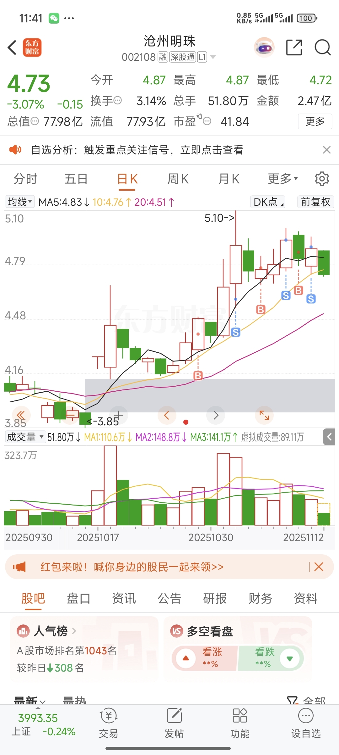 沧州明珠是唯一一个让我赚钱的股,感谢庄大哥今年这行情,我亏了30%,我真是神人