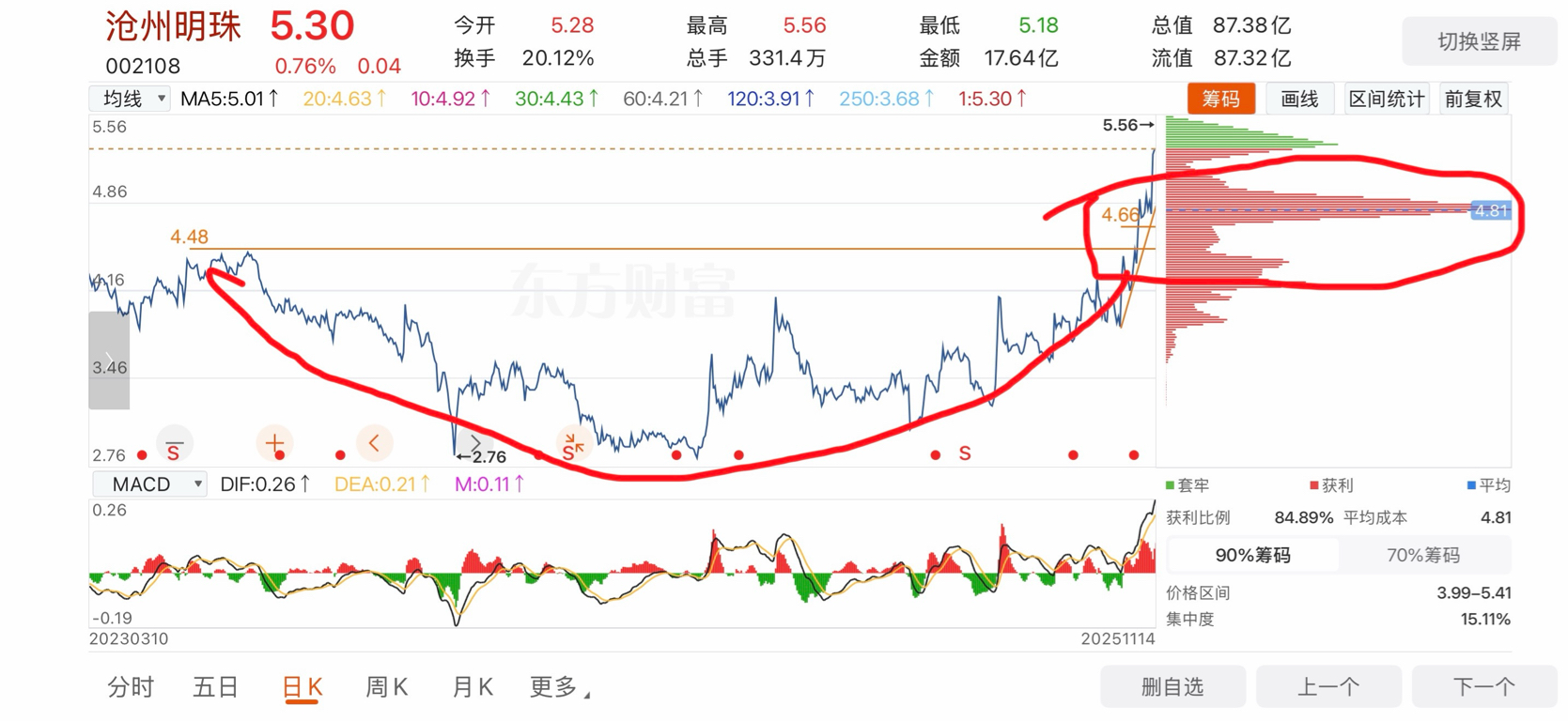 $沧州明珠(SZ002108)$ 简单的从趋势图来说,他已经脱离圆弧底,在平台震荡形成了一个新的筹码峰,庄家用2年爬上来,就这么结束了吗?我看不太可能,从最近半年来看,已经走加速上攻了模式了。这里再震荡一下,后续肯定是有动作拉升。