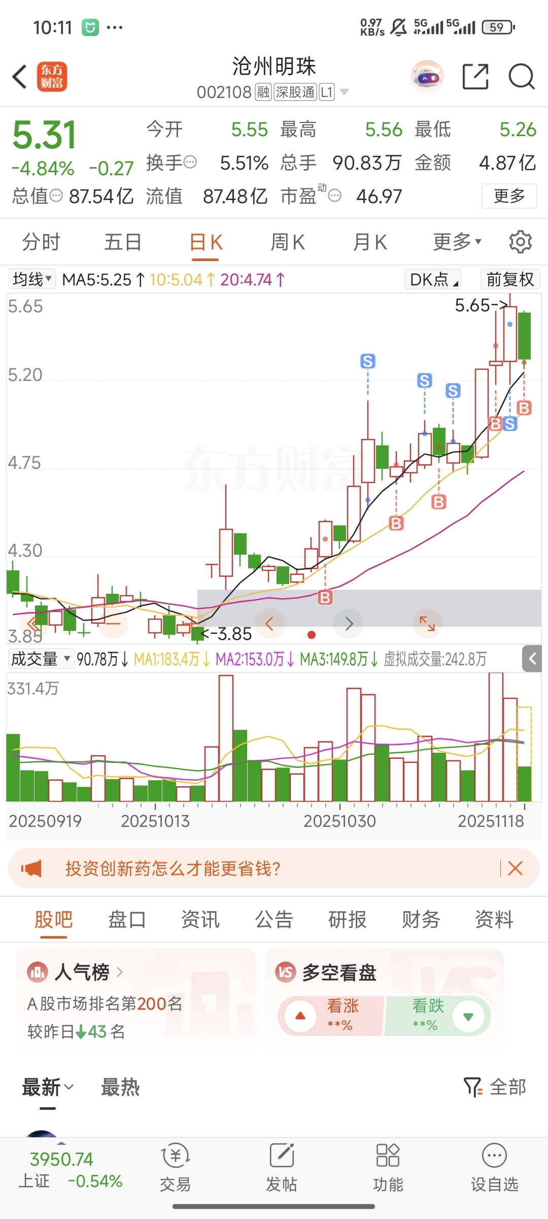 $沧州明珠(SZ002108)$ 5.30入场,希望不亏就好…!