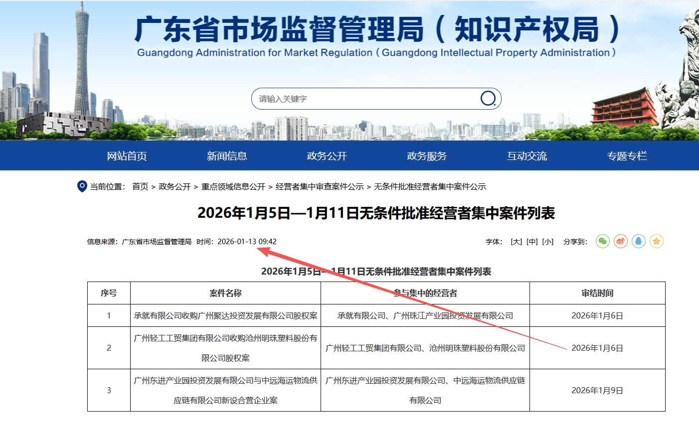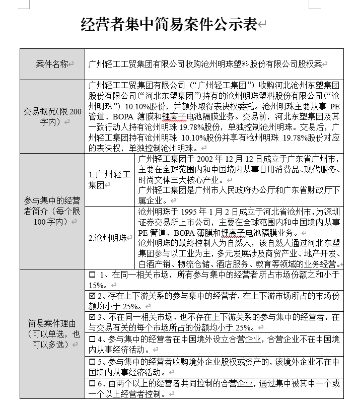 广东省市场监督管理局已公示“广州轻工工贸集团有限公司收购沧州明珠塑料股份有限公司