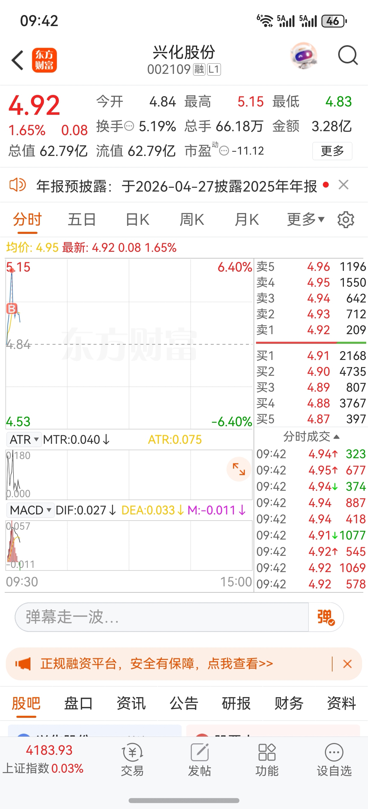 $兴化股份(SZ002109)$ 今天最高点不可能再突破了,因为我精准下单