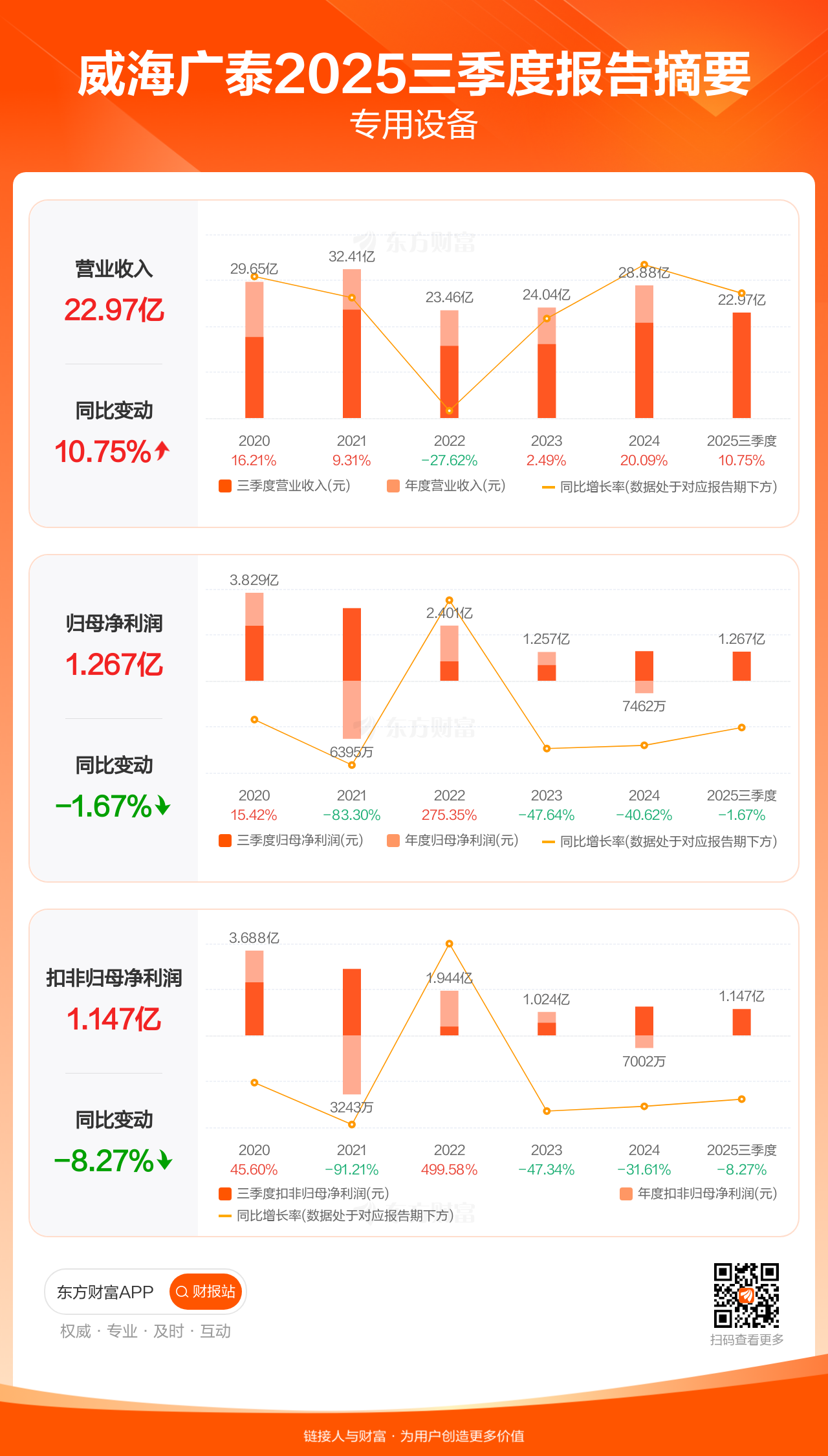 威海广泰10月31日发布2025年三季报显示,公司前三季实现营业收入22.97亿元,同比增长10.75%;归母净利润1.27亿元,同比下滑1.67%;扣非归母净利润1.15亿元,同比下滑8.27%。