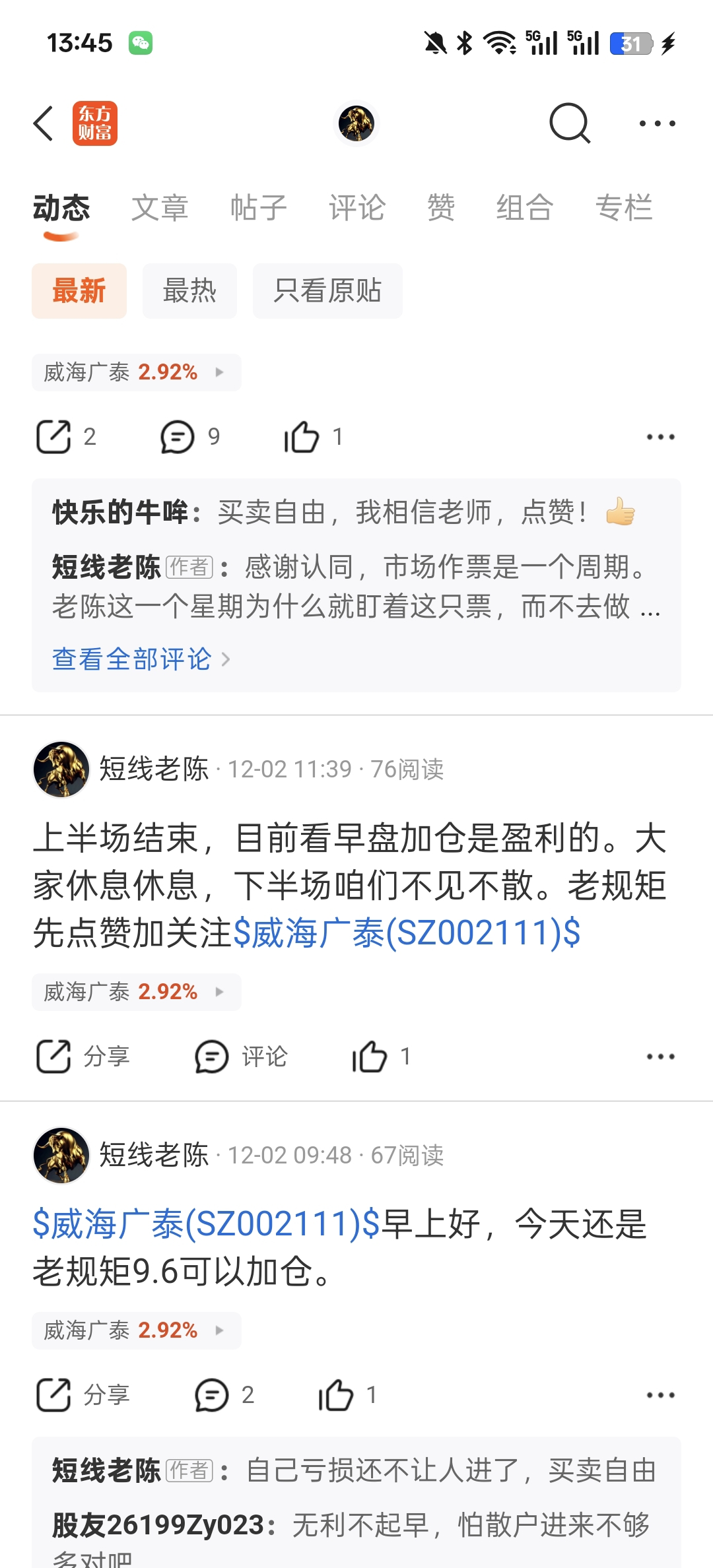 $威海广泰(SZ002111)$ 老陈专注稳定票,之前提示的加仓可以现价T出来了。有图有真相,现在不会有人喷老陈了吧