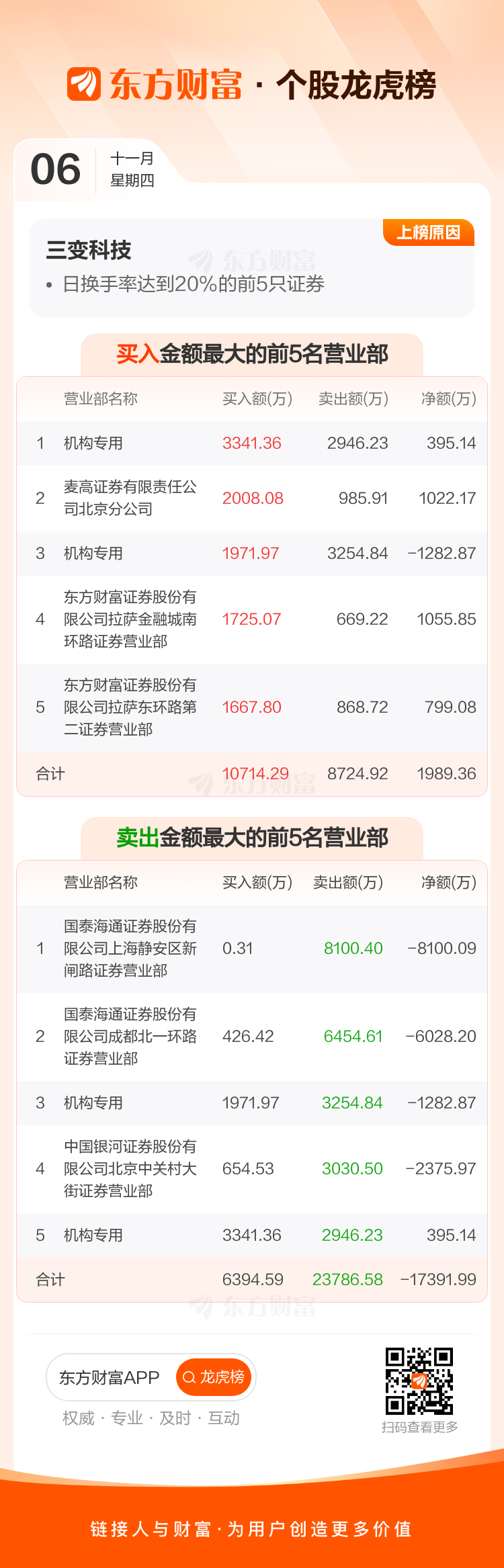 交易所2025年11月6日公布的交易公开信息显示,三变科技因成为日换手率达到20%的前5只证券上榜。三变科技当日收报15.64元,涨跌幅-2.31%,偏离值44.65%,换手率44.66%,成交额18.94亿。