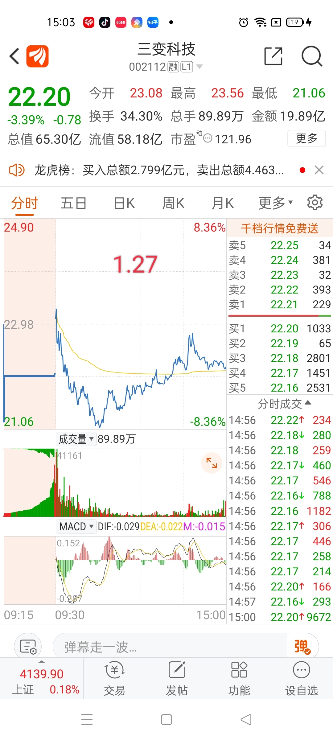 $三变科技(SZ002112)$ 连续两天都是高换手,从走势看的话庄家感觉换庄了,就是一个庄家走了,另一个进来接货,今天确实也没大跌,试盘的话不是很符合预期,我的理解是应该应该收在昨天的收盘价附近。但是由于大盘的缘故,这个股还是强目前庄家在做t尾盘看明天大概率也是边t边出货1.27尾盘评