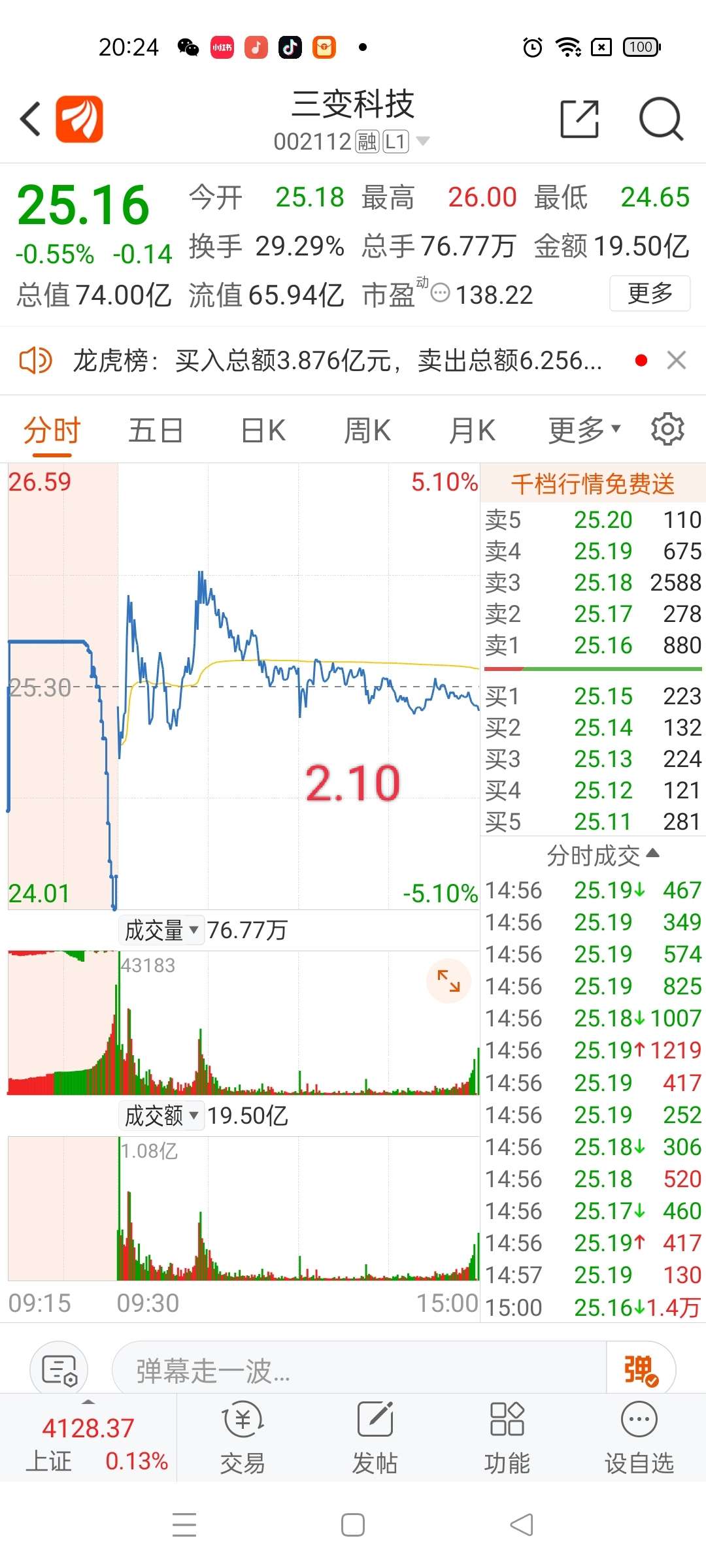 $三变科技(SZ002112)$ 2.10又是哗啦啦跳水,最后缺口巨大不足是水下开。盘中应该先下跌在翘起来是做t走势。盘中拉高的时候的跑,降下去得接回来。并不是很完美的图形。