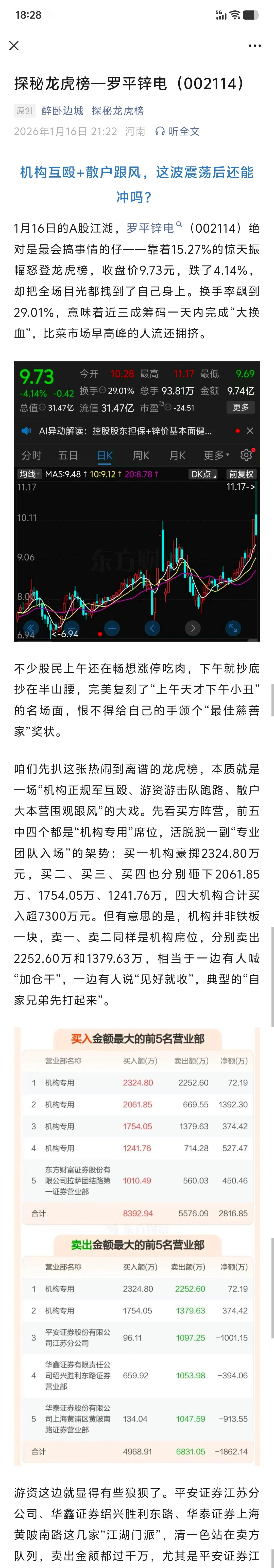 $罗平锌电(SZ002114)$ 1月16日的A股江湖,罗平锌电(002114)绝对是最会搞事情的仔——靠着15.27%的惊天振幅怒登龙虎榜,收盘价9.73元,跌了4.14%,却把全场目光都拽到了自己身上。换手率飙到29.01%,意味着近三成筹码一天内完成“大换血”,比菜市场早高峰的人流还拥挤。