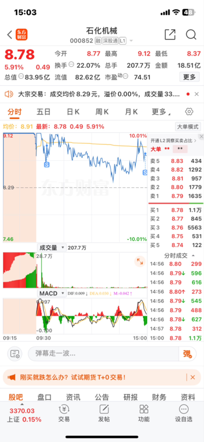 尾盘竞价抢筹挂了9.50看好明天尾盘出了石化机械,在最后也没能封住明显偏弱,走人