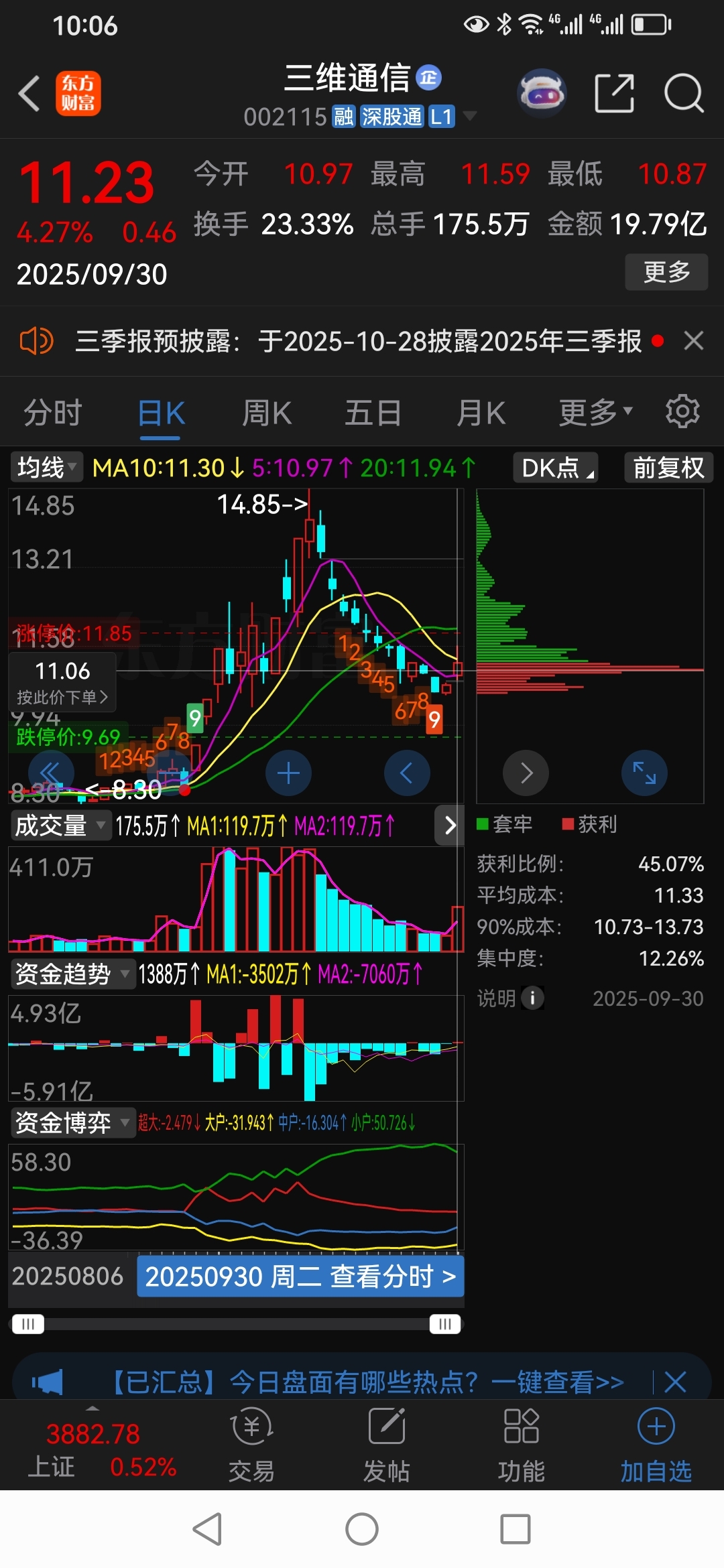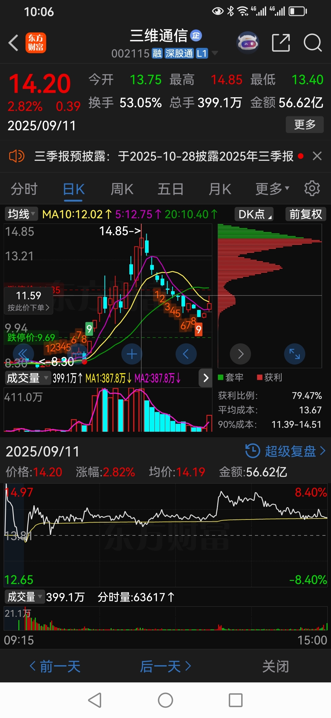 军哥炒作三维通信,涨停板,第二天放量,断板卖出。成交量放大,上涨。分时图,第二天