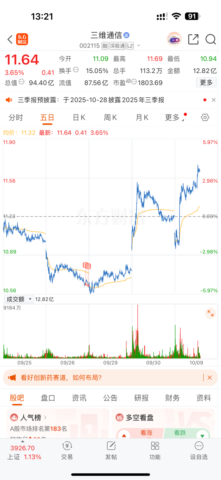 $三维通信(SZ002115)$ 随你怎么样,先拿一个星期