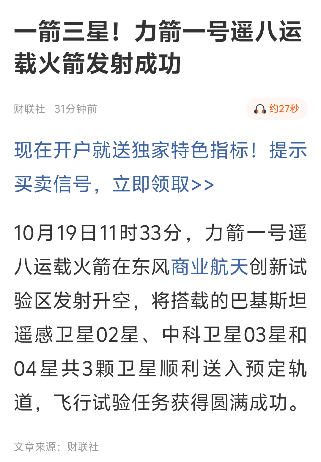 牛逼了商业航天三维通信龙头一箭三星!力箭一号遥八运载火箭发射成功现在开户就送独家