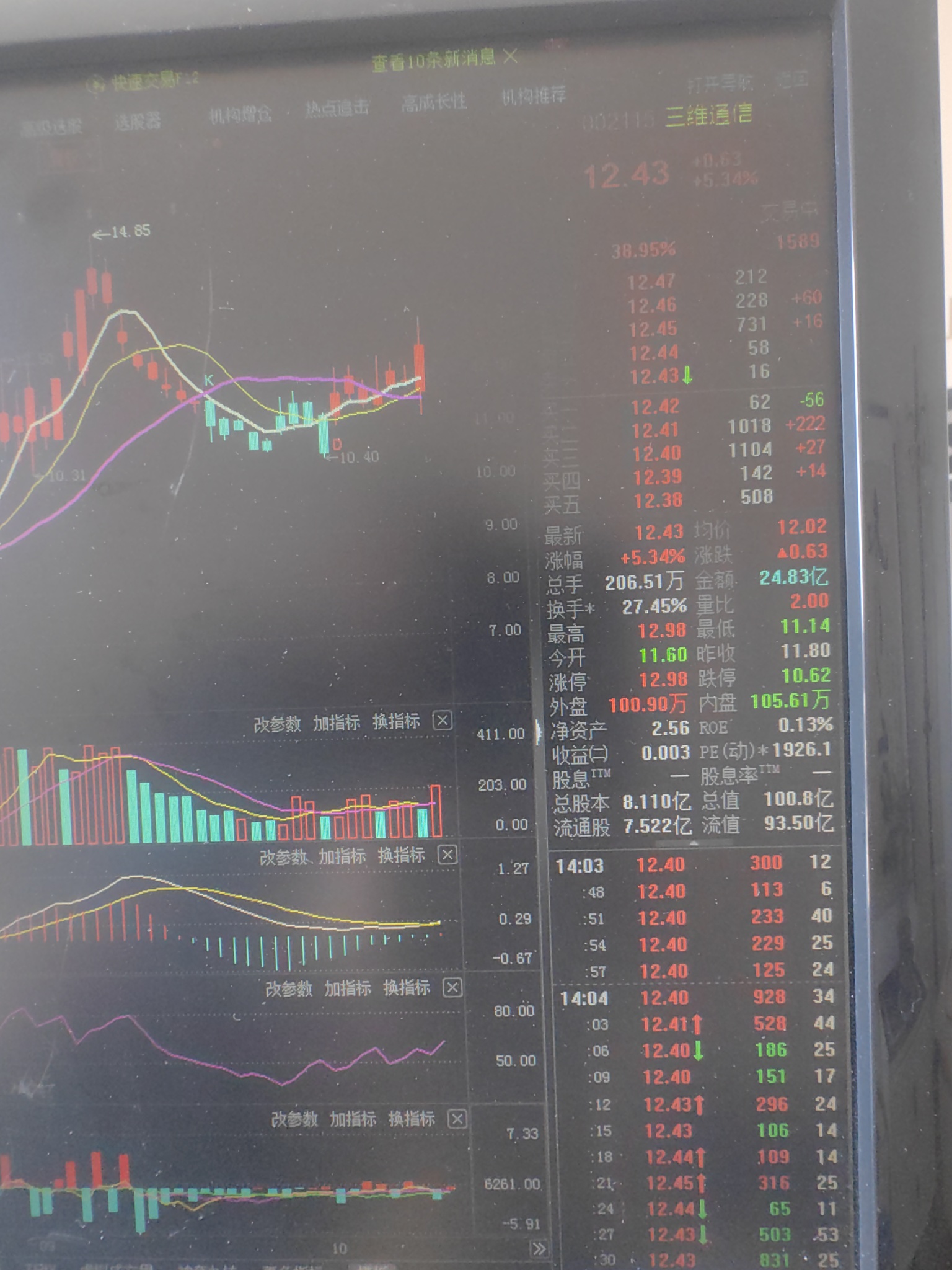 $三维通信(SZ002115)$ 看K线已经站上20日了、成交量、走势都可以呀。最下边最右边一个就是资金流开始翻红了。应该可以再拿走的吧?
