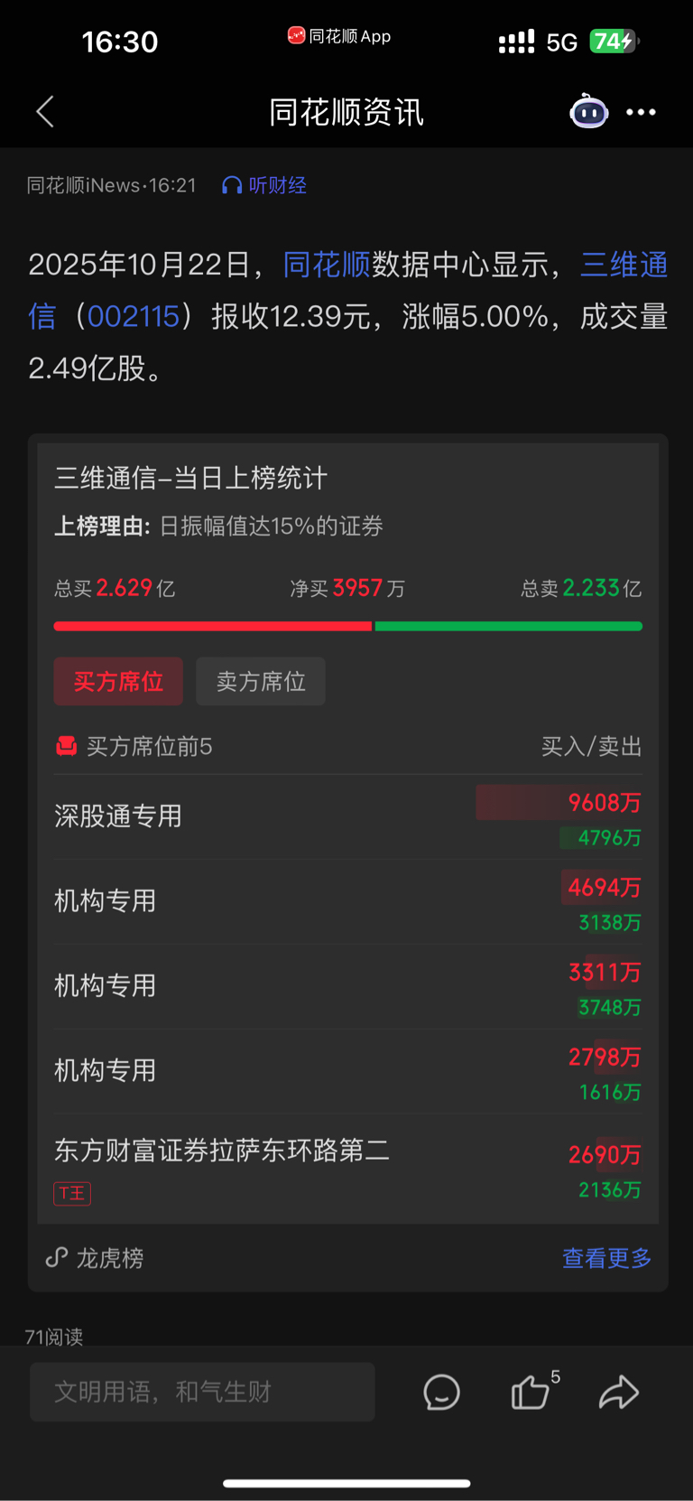 $三维通信(SZ002115)$ 龙虎榜已出,各位怎么看?