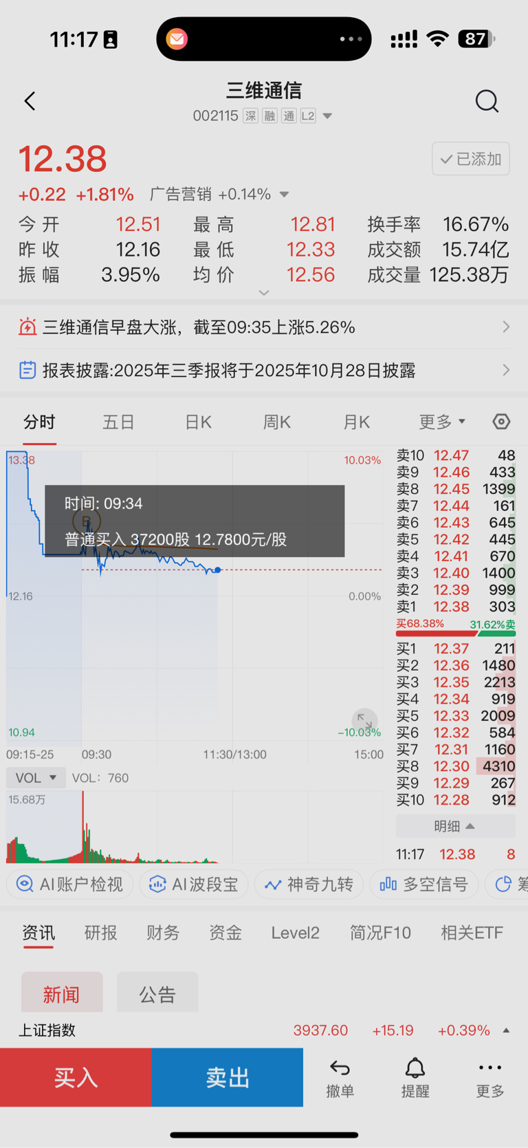 $三维通信(SZ002115)$ 这个票没什么希望了 本来想入一千左右点下火 但是应该是单边下降趋势了 预计晚上收盘-2左右 换股喽