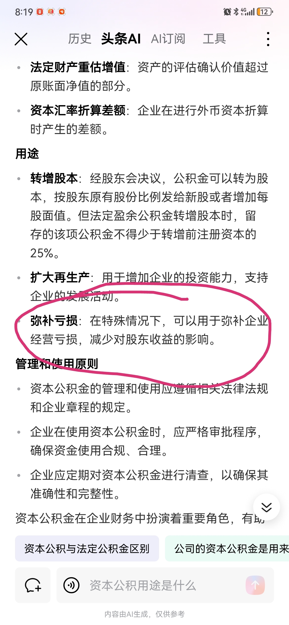 我去,我才知道资本公积金这一说,账面上还躺着11亿的资本公积金,能弥补多少年的亏