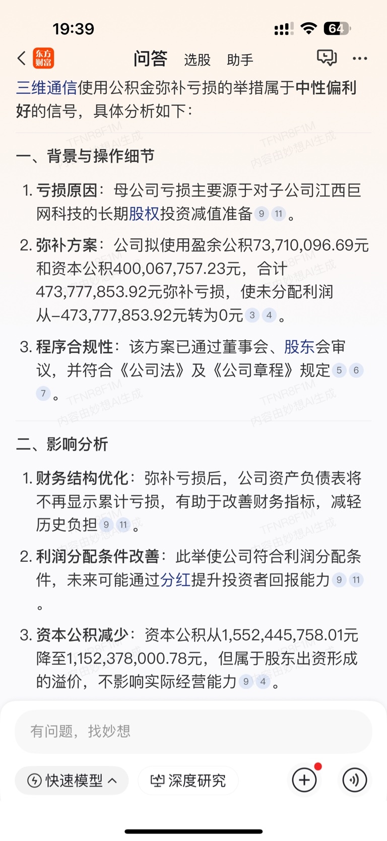 $三维通信(SZ002115)$ 这个总体来说偏一点点利好吧,就是以前亏损的钱现在用公积金抵消了,财报不再显示亏损了