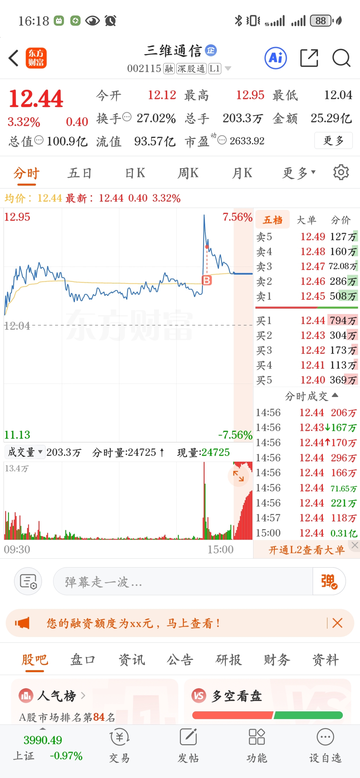 $三维通信(SZ002115)$ 接了主力的飞刀