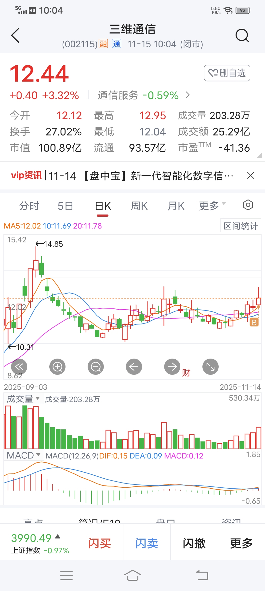 $三维通信(SZ002115)$ 周五我也买了这只票,不知道是福是祸。不过心里还是比较踏实,套的概率很小