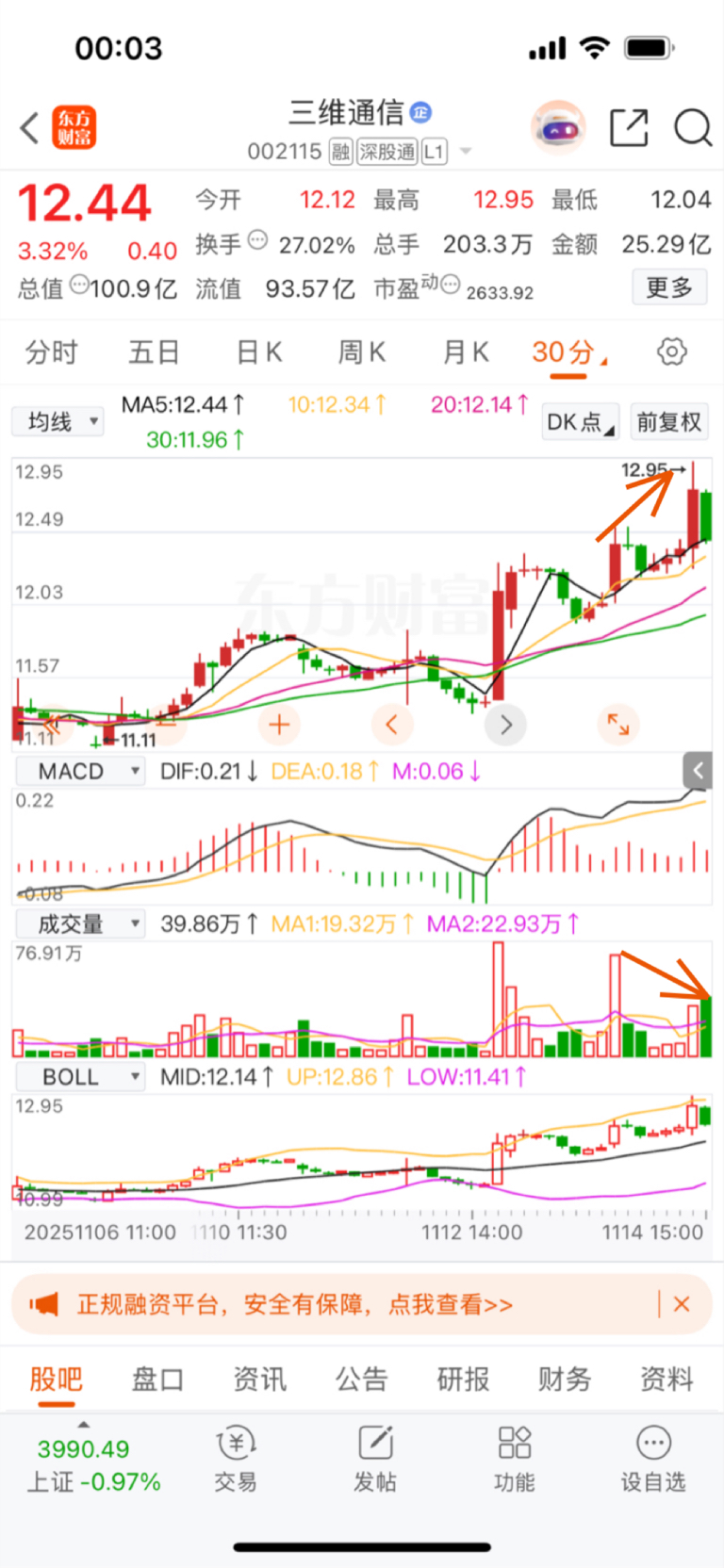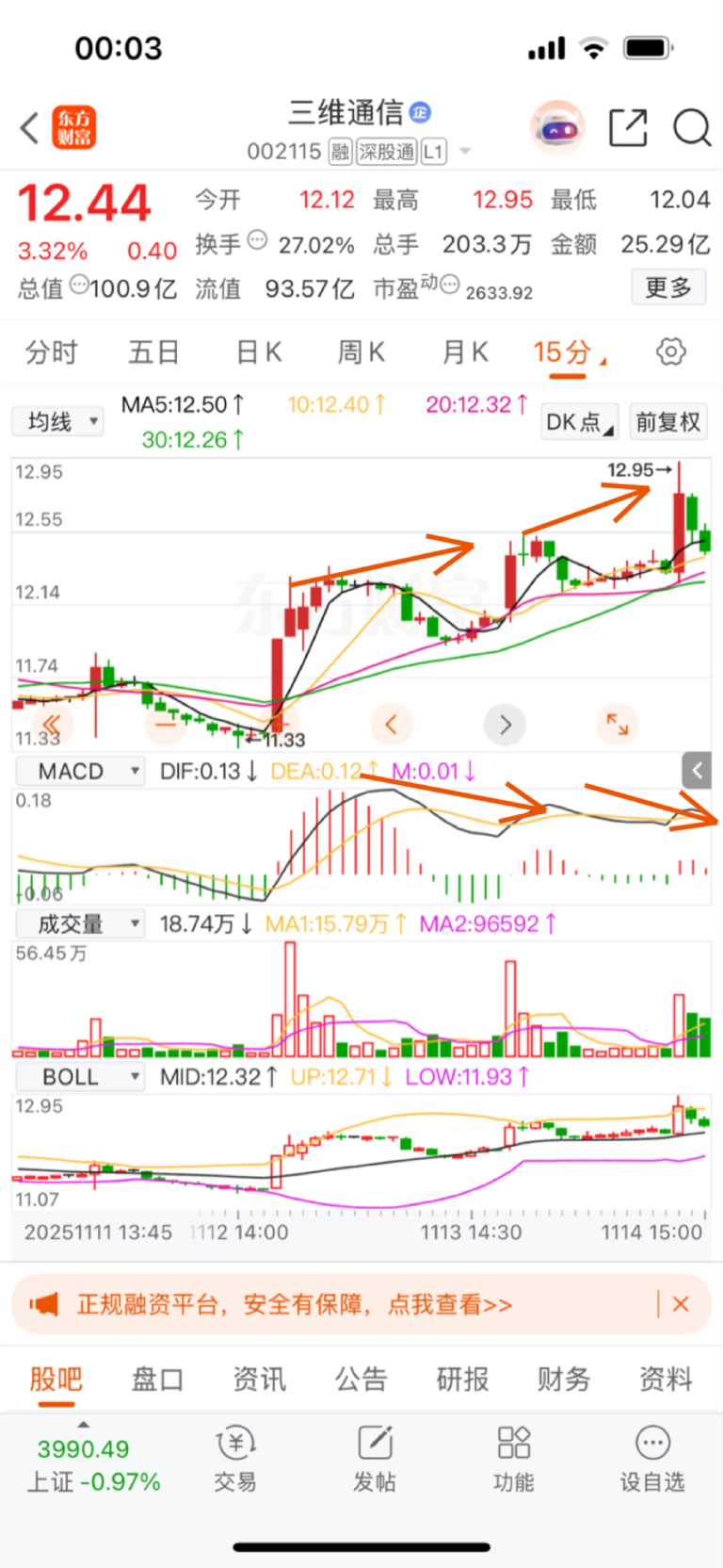 $三维通信(SZ002115)$ 这个咋说呢,我给你说两点不做的原因,15分钟背离再背离,拿菲波那切数列来讲,这一笔向上走了八天,是个变盘节点,你可以参考左侧13号向上的一笔也是8天,然后回调,成交量的话并没有超过22号量不够,这里有堵的成分,所以小心,尾盘偷袭回落四个点的抛压,最后的30分量价背离