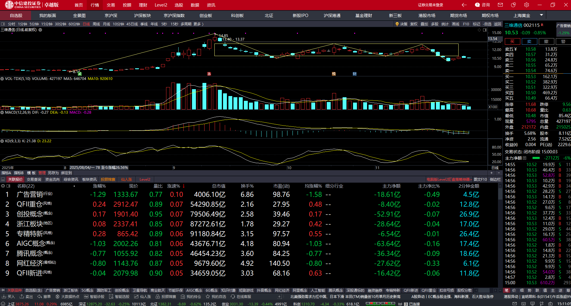 三维如预期中的调整,一点量能都放不出来,下午商业航天的大哥都集体回流,虽然尾盘回落,但冲高的过程三维一点都不跟,所以可以看出三维短期还是一个弱势调整的过程中,股价是有可能去下探10.33位置的。昨天反弹最高点刚好是日线次级别中枢的下沿,反弹不过又回到下方震荡,那么这里股价如果没办法选择放量重新站回11元,下探是必然的,明天依旧主观预期看调整。明天想补子弹的朋友可以考虑补一到俩层仓,长线朋友可以不用动了,短期一波大的振幅已经过去了,现在就是属于一个平稳调整的过程,小跌小涨慢慢洗盘吸筹,等下次航天题材反复的时候三维还是有机会成为龙头的。