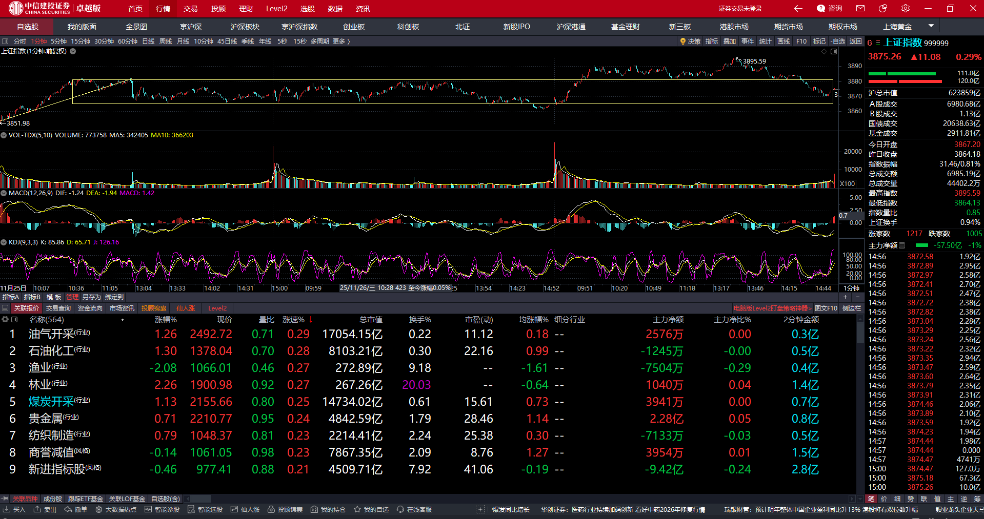 首先上证指数,今天没按预期中的调整,指数是走了周二收评的第一种预案,就是放量拉过3878之后回踩不漏,那今天尾盘最终还是干漏了,而且今天的涨跌家比是基本持平的,这俩天基本都是拉的大票,你们手中的小票红没红只有你们自己清楚,指数是个参考指标,个标要看自己的审美以及实力如何,那这个位置提示风险我觉得并没有什么问题,而且今天在一分钟中枢拉出之后,打出了一个五分钟的顶背驰,叠加日线级别的多条均线反压,这个地方调整随时到来,你们自己做好心理准备,这里的反弹其实随时可以终结了。
