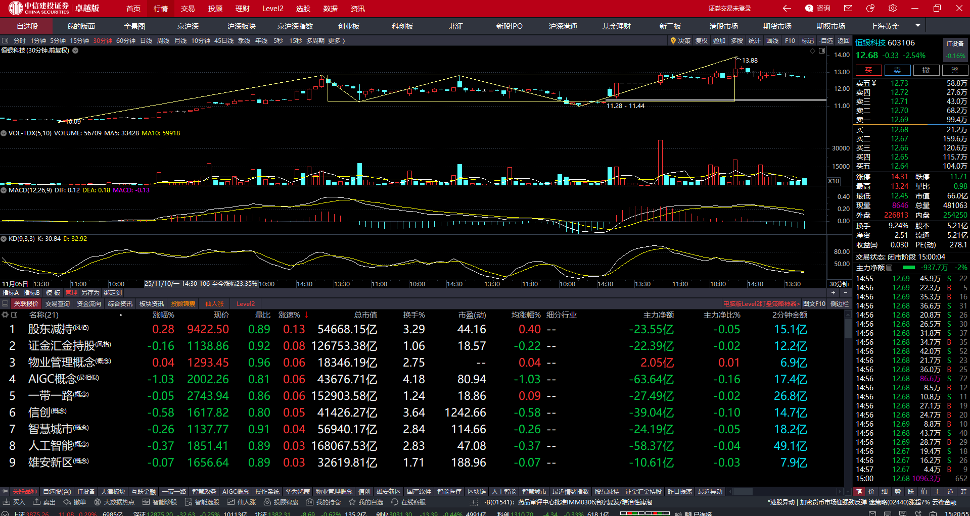 昨天止盈了雪人之后今天买入恒银。恒银在五分钟中枢构建完成之后昨天尝试放量突破,但是回落幅度过大,今天选择低开洗盘一天,目前构筑了一个五分钟的次级别奔腾中枢,目前在中枢内部震荡,那么技术上是可以再次去过中枢,走一个五分钟的离开段的,主要是看力度。力度强的话这次可能就是新高见了,去年以及前俩个月的高点将一举突破。如果量能不够的话这里如果跌破奔腾中枢那我只能止损了。沙盘推演一下,明天五日线刚好开在12.67。如果明天可以稍微低开一些,然后直接站回五日线是最好的走势,开在12.50左右,然后去走一个五分钟的离开段。那今天洗盘的进度应该就结束了。这种小票一旦启动就是连扳,所以耐心持有。