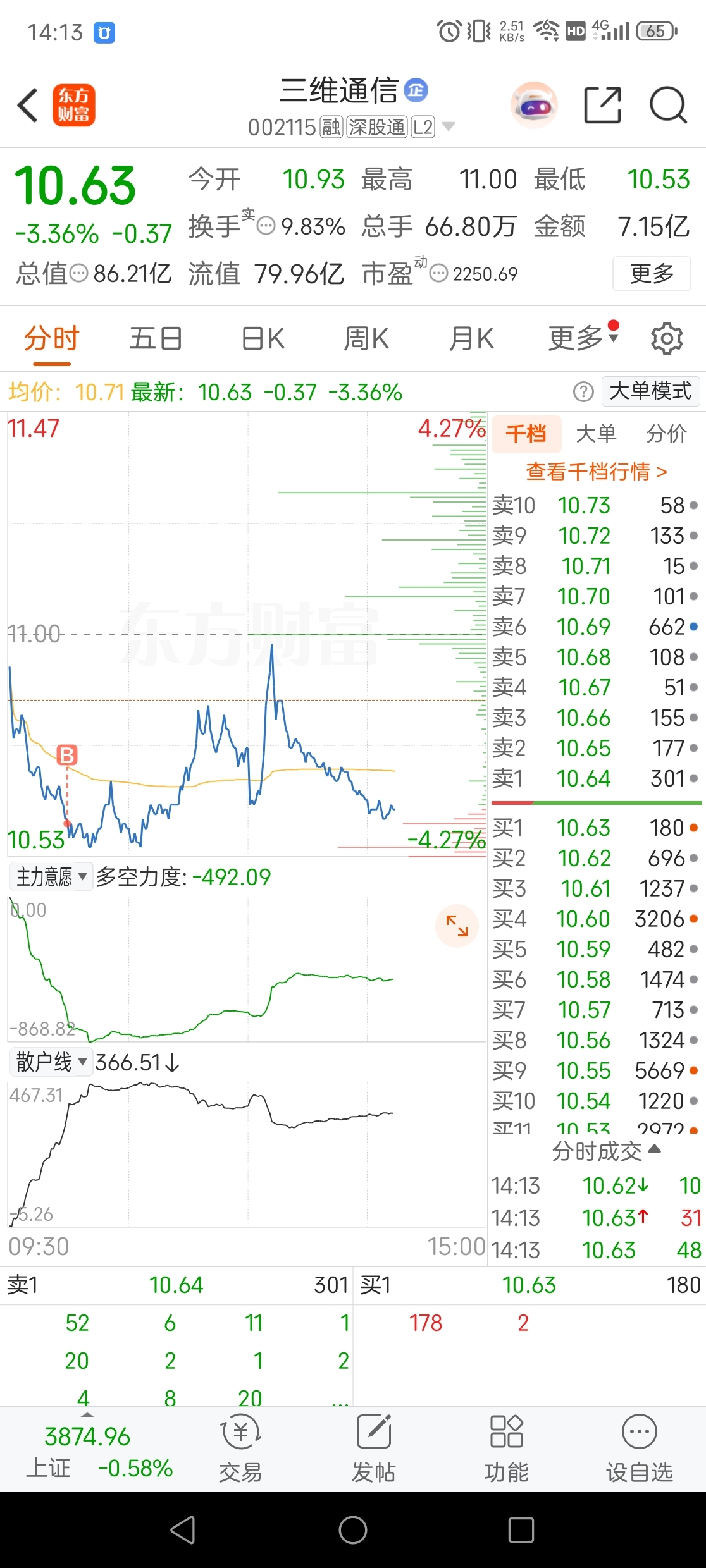 $三维通信(SZ002115)$ 中午睡觉没卖到,主力再拉一次好嘛?这次我一定交筹码。