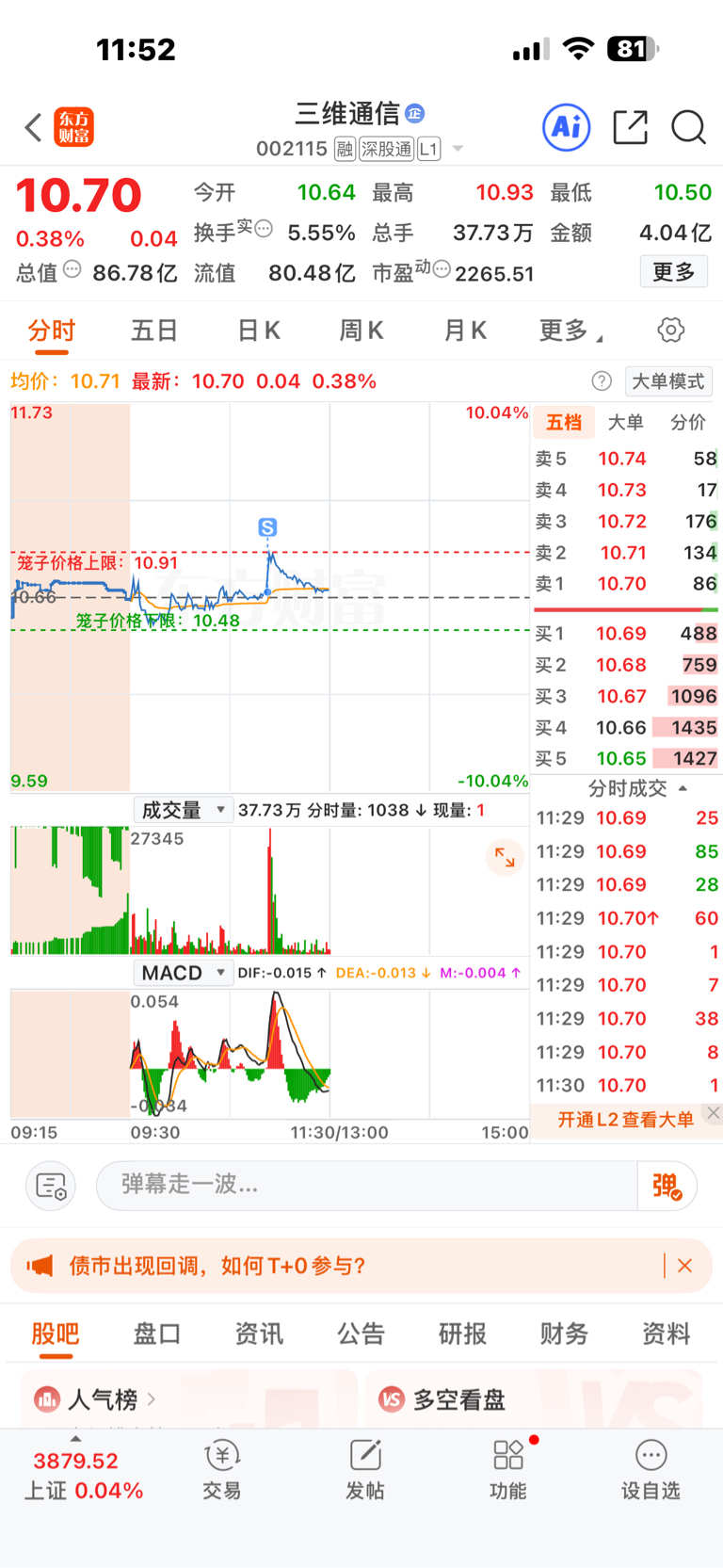 $三维通信(SZ002115)$ 这个票没多大意思了,什么板块都不跟,天天就抽搐一下,卫星起来它不动我就知道今天没戏了