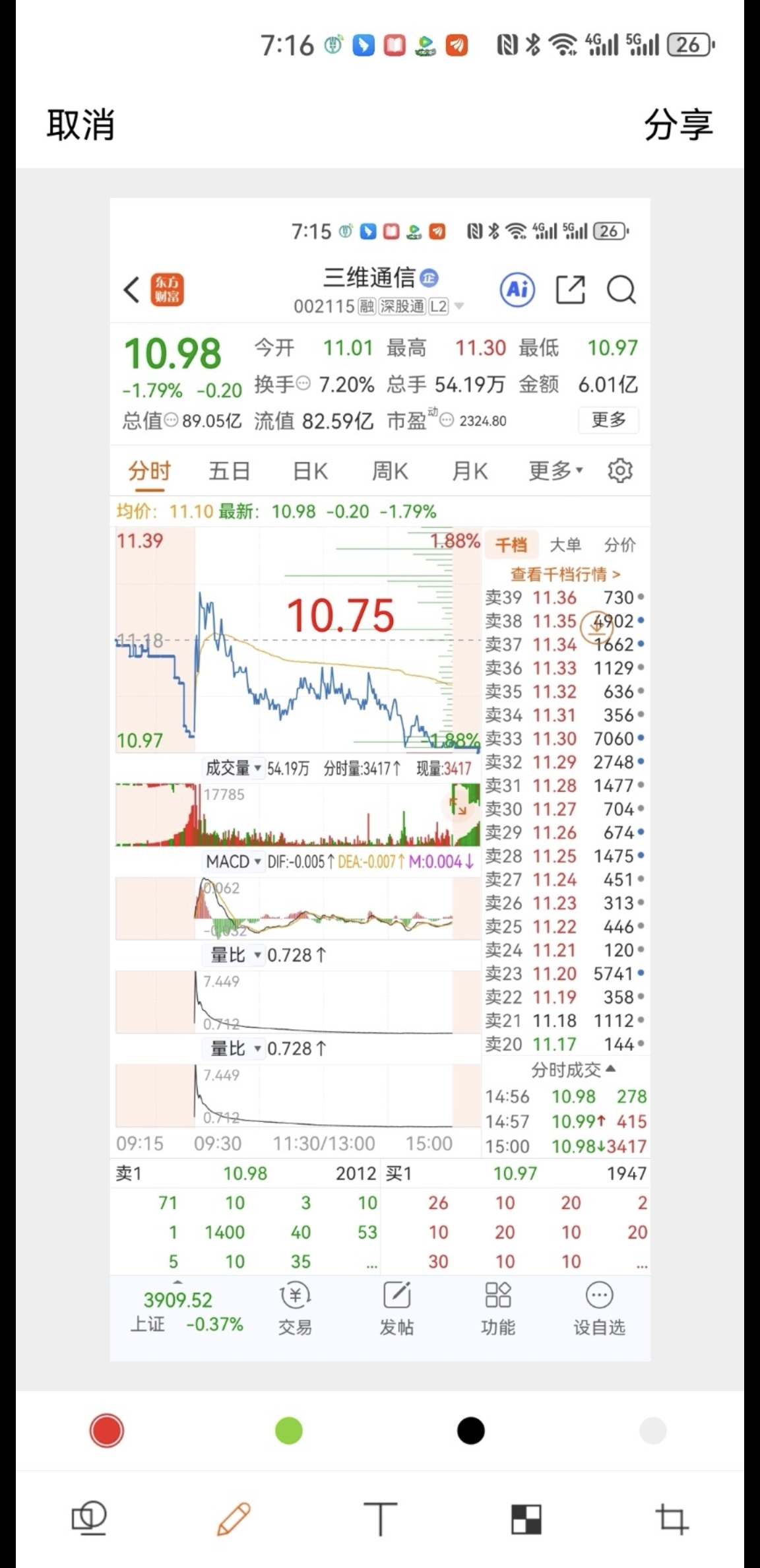 $三维通信(SZ002115)$ 和昨天预测的低点接近 继续持有